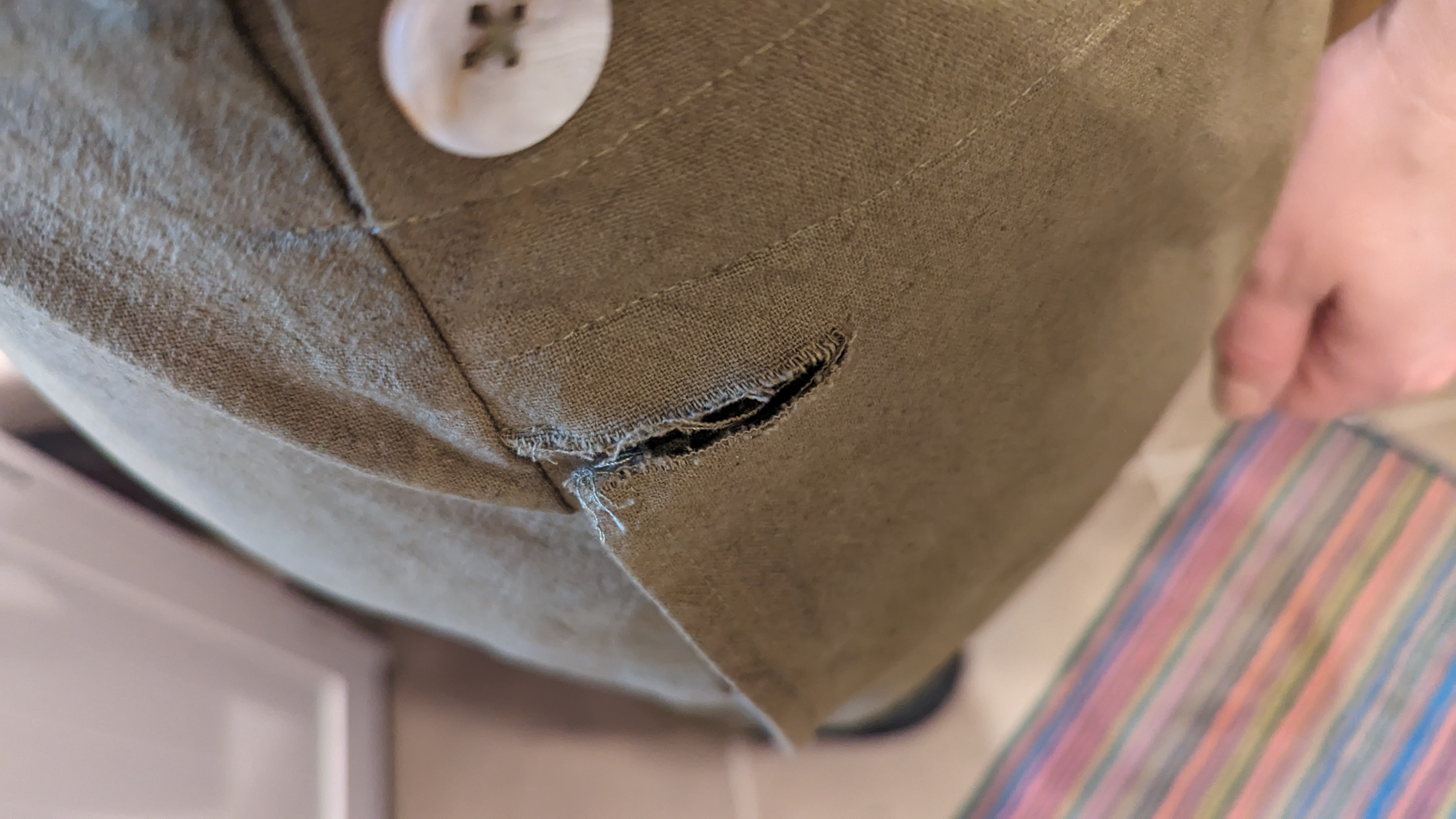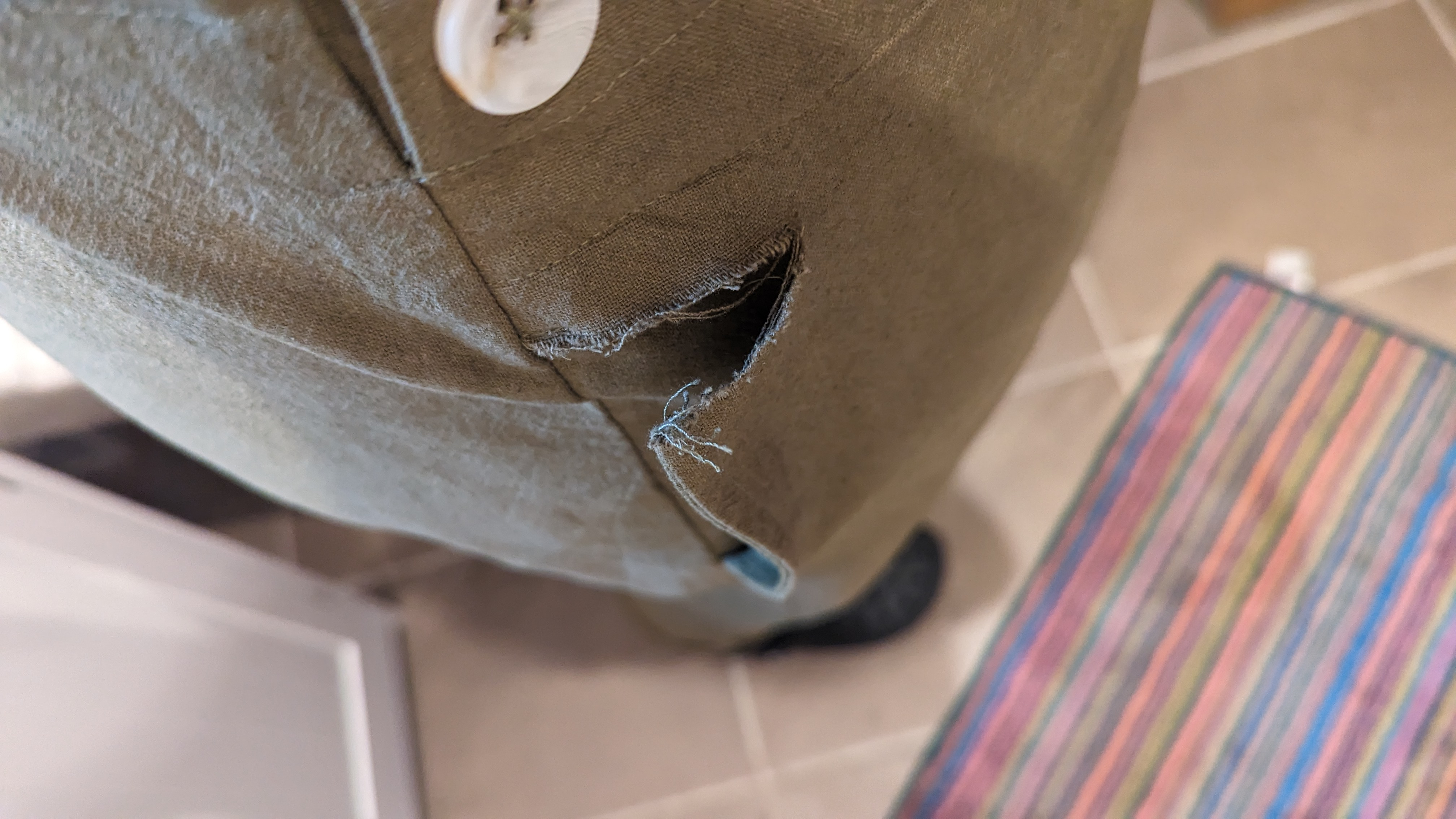 I hope you can help! I purchased this item of clothing (dungarees) yesterday at a shop in a little seaside town we were visiting. Today I've decided to wear the item, and have probably been wearing for 4-5 hours whilst sat at home studying at my desk and just general pottering about. I've gone to get changed and noticed that there is a huge tear in the fabric at the top of the pocket- not on a seam etc just crudely across the fabric! I haven't put anything in the pockets and havent caught myself on anything, so of course am confused, not to mention disappointed. Especially considering I spent £85 on them.