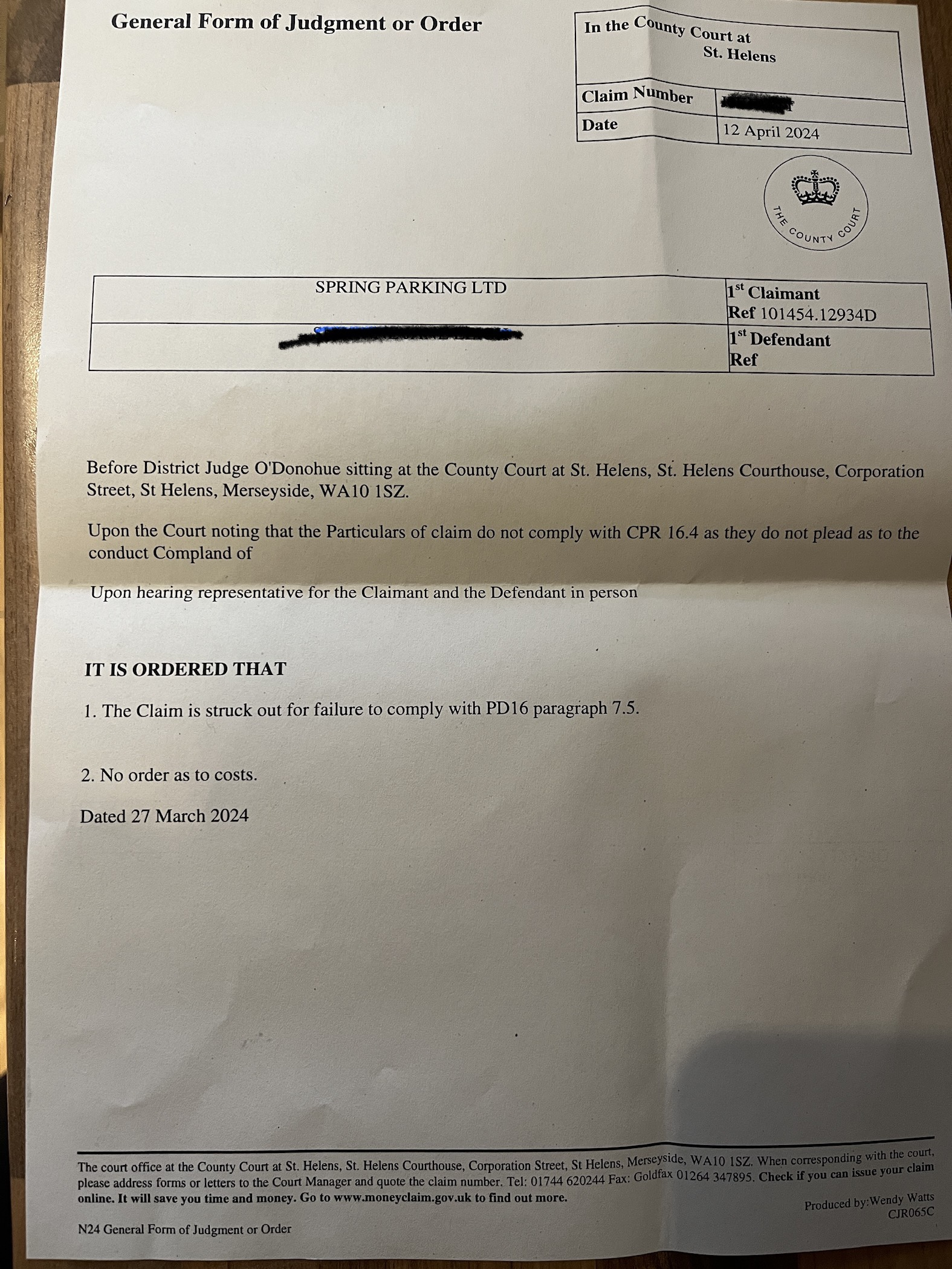 It was at St Helen’s so she’s on The North West circuit, District Judge Donaghue. I didn’t pay a set aside fee, DCB legal paid for that as it was their error in issuing the CCJ & the complaint was upheld.No costs were awarded & I was too stunned by the speed & turn of events to even think to mention any before we were dismissed. I’m just glad it’s over!2