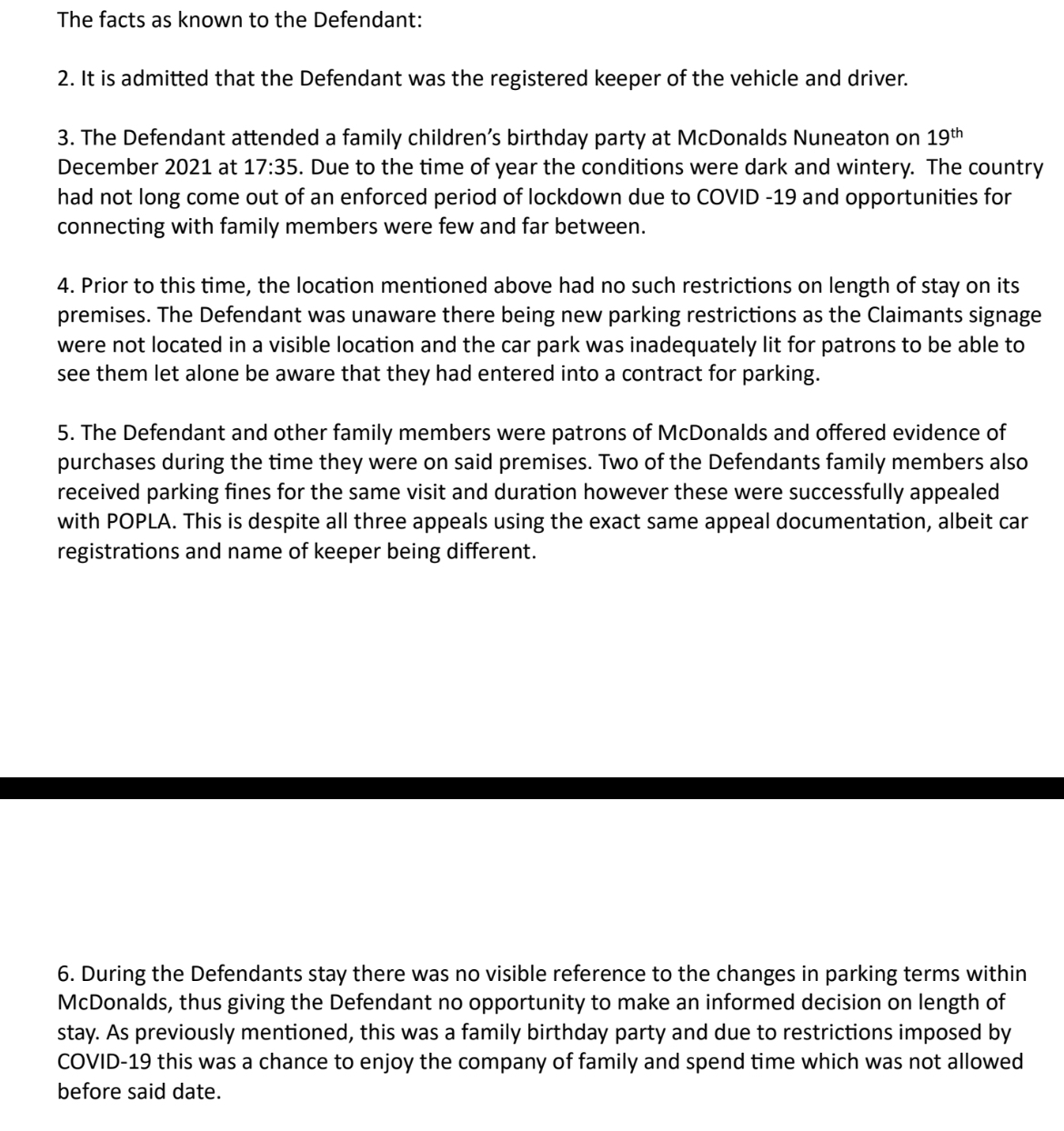 5. The Defendant and other family members were patrons of McDonalds and offered evidence of purchases during the time they were on said premises. Two of the Defendants family members also received parking charges for the same visit and duration however these were successfully appealed with POPLA. This is despite all three appeals using the exact same appeal documentation, albeit car registrations and name of keeper being different.