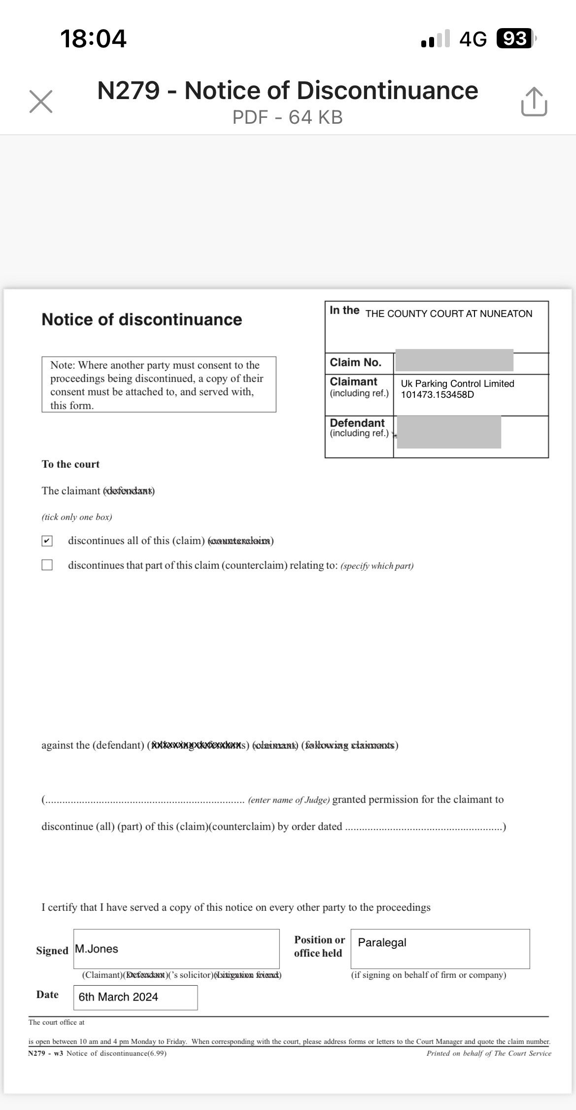I have added you to the 'disco' thread.Can you show us a redacted copy of that discontinuance? It helps to show none of this is hearsay.PRIVATE 'PCN'? DON'T PAY BUT DON'T IGNORE IT (except N.Ireland).