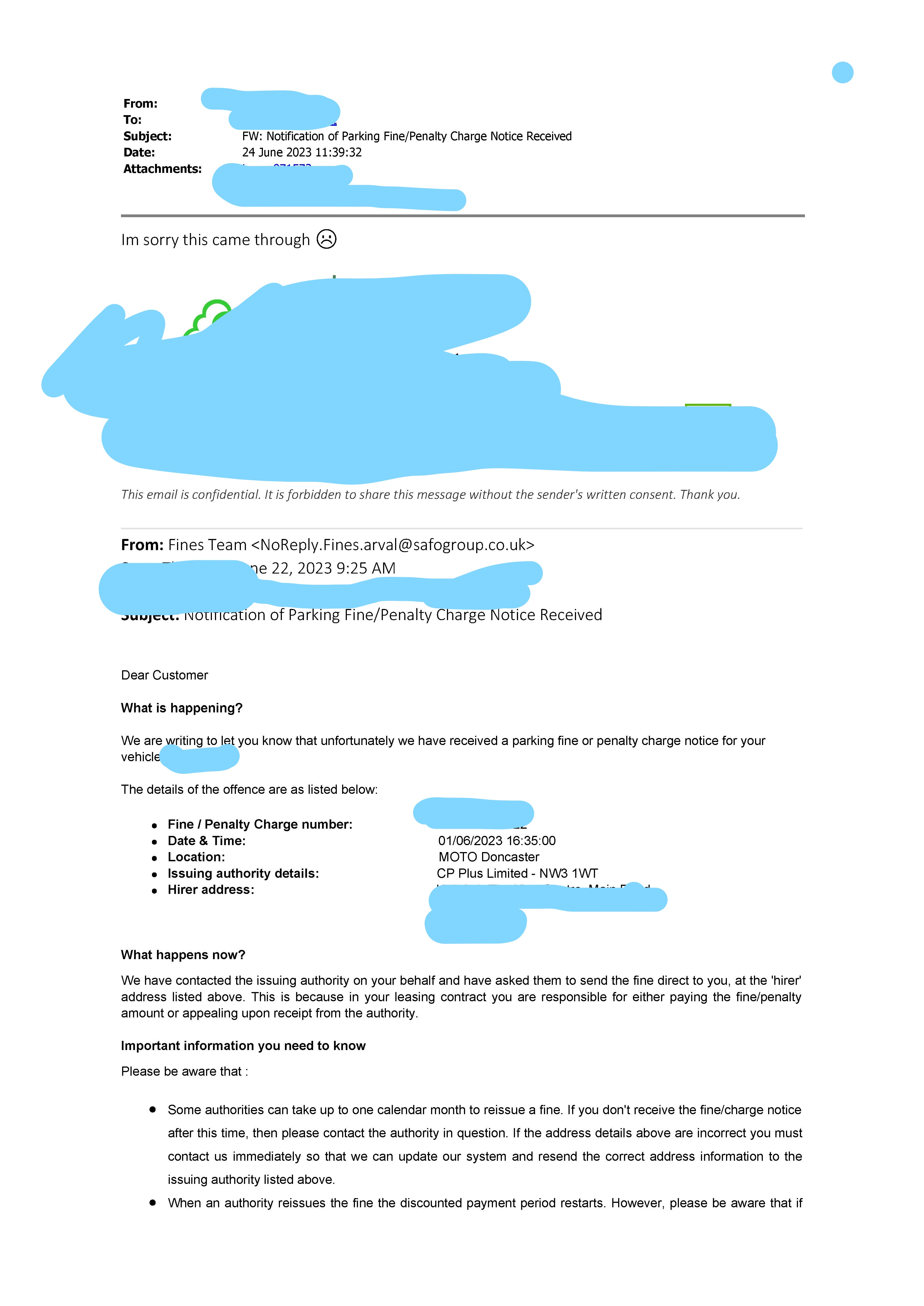 First email contact forwarded from my work secretary from the lease company with the PCN scan attached. (PCN see below)