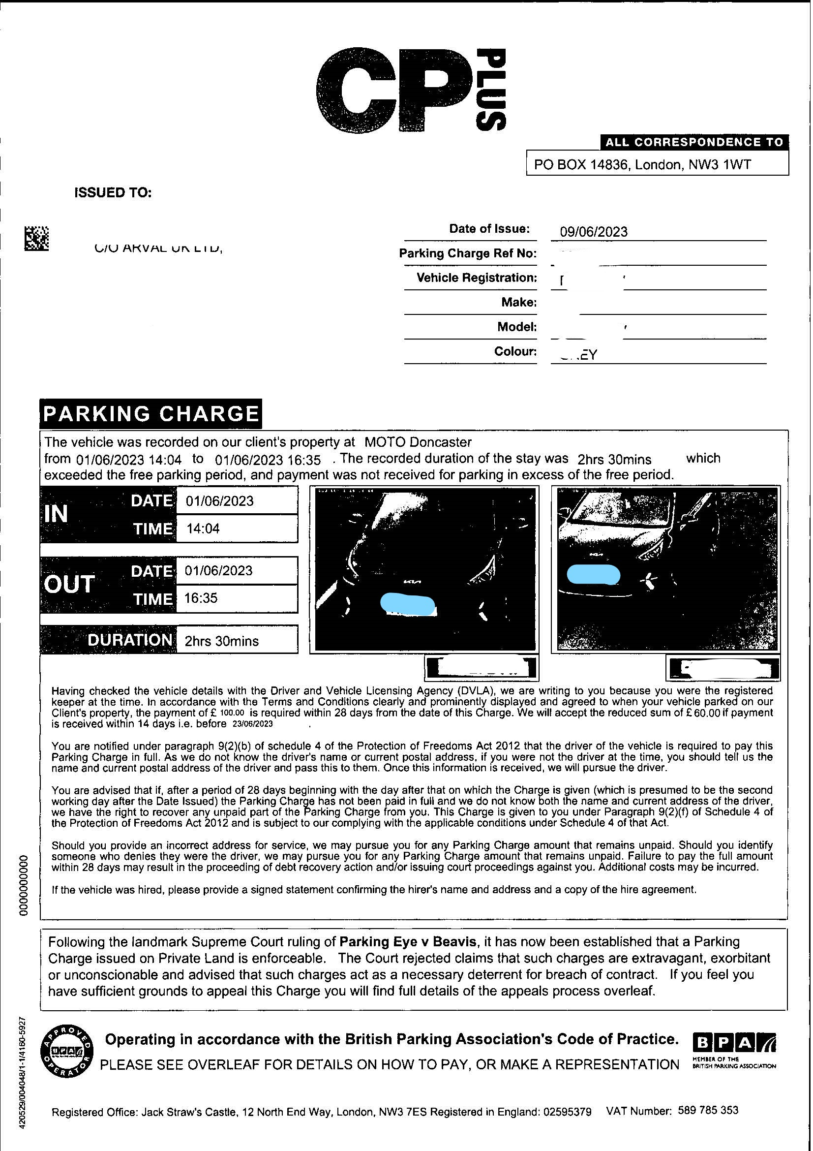 On 22nd June 2023 CP Plus issued a Parking Charge Notice (dated 9th June) to MY COMPANY via Arval Uk Ltd as the registered keeper. This was forwarded via email to myself (as hirer/lessee of the vehicle) and the notice highlights that the above mentioned vehicle had been recorded via their automatic number plate recognition system for “exceeding the free parking period”.