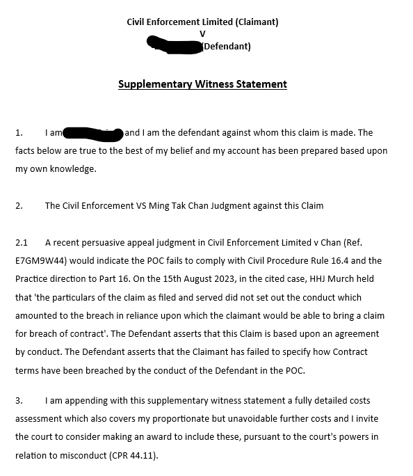 "a recent persuasive appeal judgment in Civil Enforcement Limited v Chan (Ref. E7GM9W44) would indicate the PoC fails to comply with Civil Procedure Rule 16.4 and the Practice direction to Part 16. On the 15th August 2023, in the cited case, HHJ Murch held that 'the particulars of the claim as filed and served did not set out the conduct which amounted to the breach in reliance upon which the claimant would be able to bring a claim for breach of contract'. The Defendant asserts that this Claim is based upon an agreement by conduct. The Defendant asserts that the Claimant has failed to specify how Contract terms have been breached by the conduct of the Defendant in the PoC."
