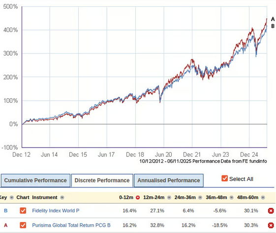 Blue line above red line most of the time, and when red line moves above blue line, it gives up all of its gains during the next fall. I reckon there are 3-4 years of outperformance there out of 13. That is nowhere near 80% of the time.The Purisima fund is a classic example of a fund with zero risk management that just puts its investors' money at greater risk, but eventually takes back all of the extra returns for the fund manager rather than the investor. Investor takes the extra risk, fund manager takes none of the risk and all of the extra reward.Any sale of it as "high performance" and "risk managed" is a con. It is an expensive closet tracker with some extra high risk stuff thrown in to cover the fees.If you bought the index tracker in the blue line, you'd have a gentler ride with essentially the same growth (if you subtract the extra platform fees required to go with Fisher then you'd be considerably better off with the index fund on a cheap platform).It actually makes me furious that people like yourself who are putting their trust in outfits like this are being exploited in this way.6 -