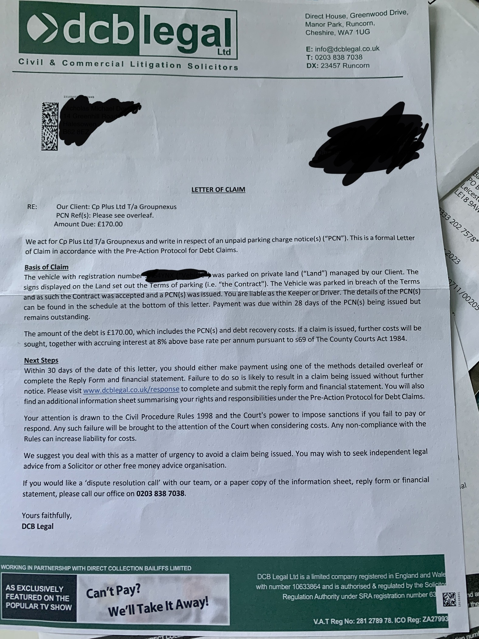 Please show us this piece of paper but without your data, claim number or password.PRIVATE 'PCN'? DON'T PAY BUT DON'T IGNORE IT (except N.Ireland).