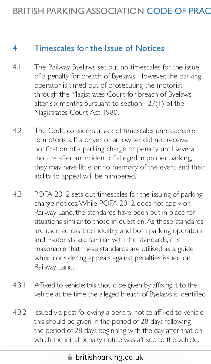 See point 4 of Annex G where the BPA says that the SAME TIMELINE for Notices must be applied as is set out earlier in the Code (in this case the relevant timelines and notices for an operator to mirror, is in the earlier BPA CoP section about about NTKs following a windscreen PCN, in cases where the driver remains unidentified and where an operator wishes to invoke 'keeper liability'):