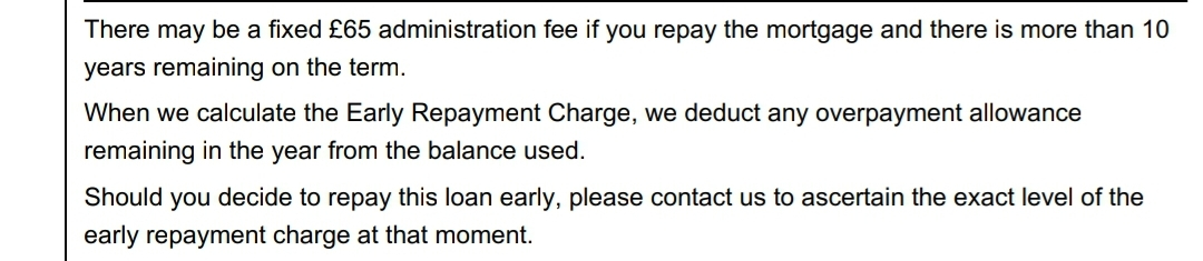 I didn't see a £65 fee, I only have 29 months left to pay.stuartm100 said:Check your new mortgage offer when it comes through about the £65 fee. I secured a new rate with Nationwide a couple of weeks ago and my offer says I only have to pay the £65 if I pay the mortgage off more than 10 years early (part 7 of the offer)