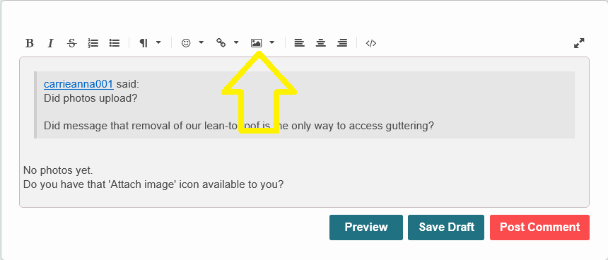 Did message that removal of our lean-to roof is the only way to access guttering?No photos yet.Do you have that 'Attach image' icon (yellow arrow) available to you? What size are your photos in MP?