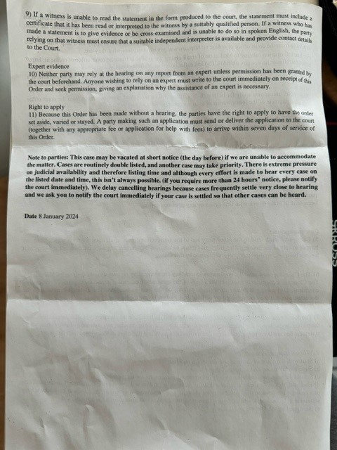 "Good morningI am the case handler in respect of the above matter, which is listed for a hearing on 22 March 2024, with parties due to file and serve their witness evidence by 8 March 2024.