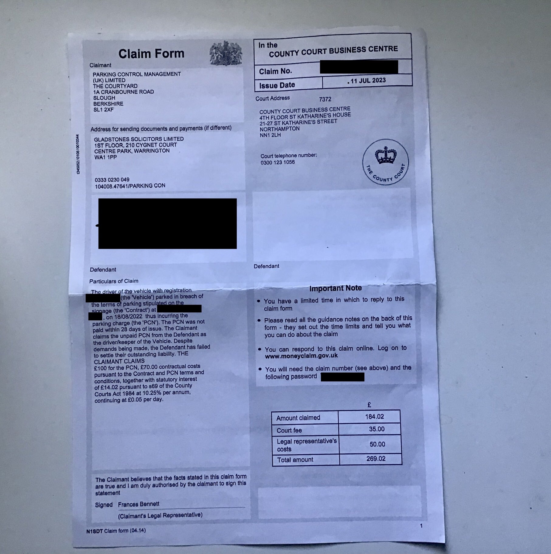 Parking Control Management (UK) Ltd Claim letter