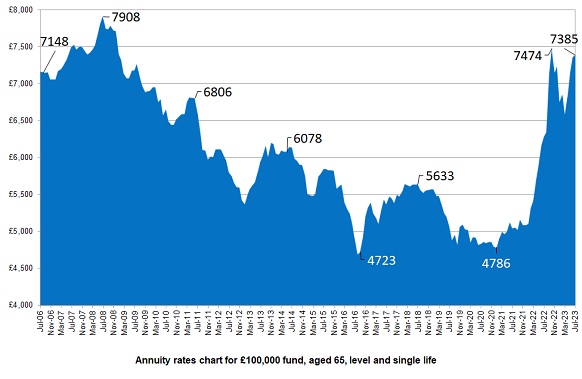 Perfo said:And they always will be providing the scheme doesn't go bankrupt or pillaged by ne'er-do-wells. The thing that changes is the as the CETV gets higher or lower is whether its worth the risk going it alone and cashing in.. In the high days of the CETV i would think it was definitely worth a good looking at. At the moment it appears not to be..I saw this chart earlier (showing 17 years of annuity rates) and thought of this thread:N. Hampshire, he/him. Octopus Intelligent Go elec & Tracker gas / Vodafone BB / iD mobile. Ripple Kirk Hill Coop member.Ofgem cap table, Ofgem cap explainer. Economy 7 cap explainer. Gas vs E7 vs peak elec heating costs, Best kettle!