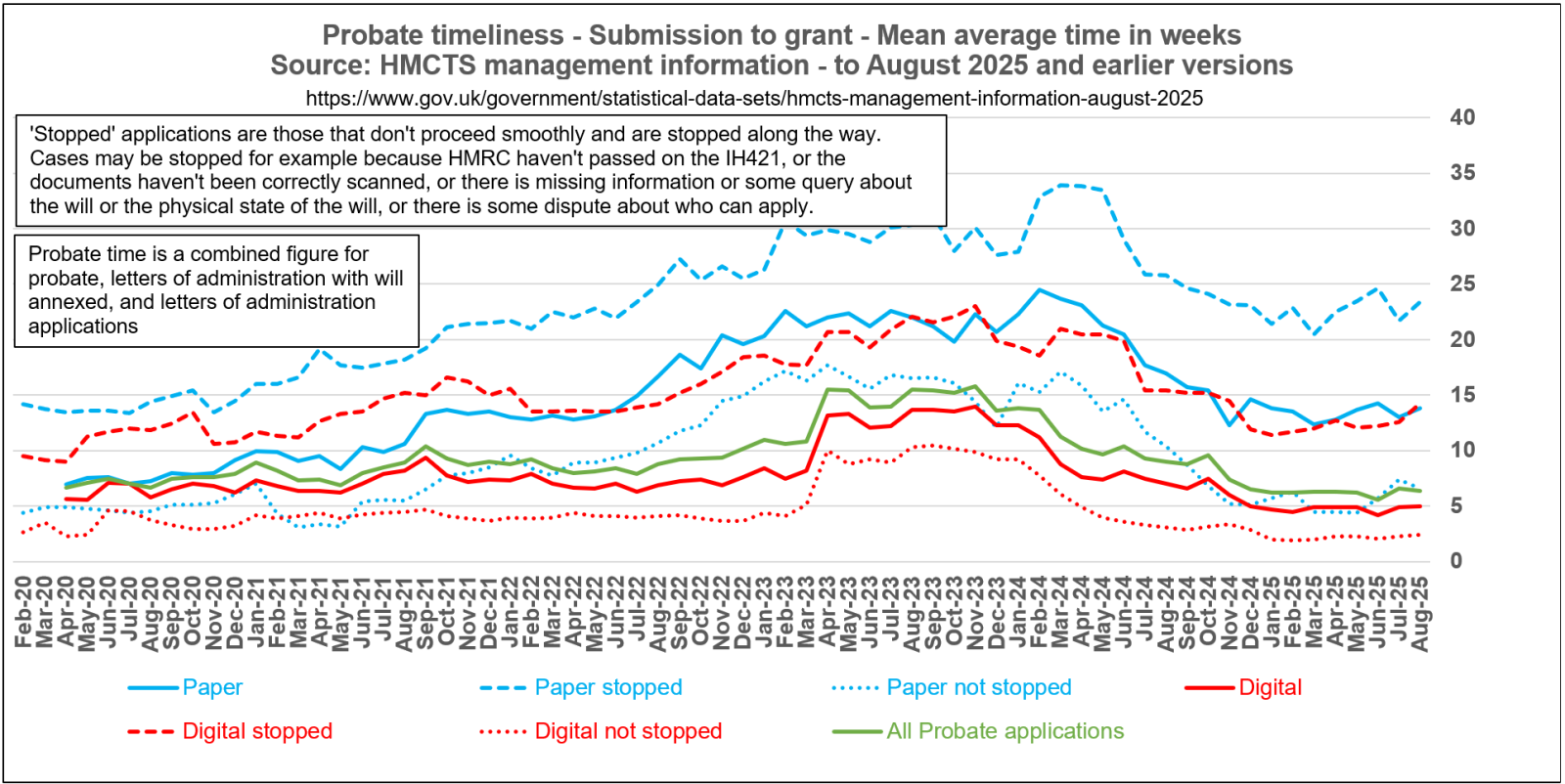 And here is my chart from that data of the average wait times over time for digital/paper, stopped/non stopped grants issued up to August 2025.