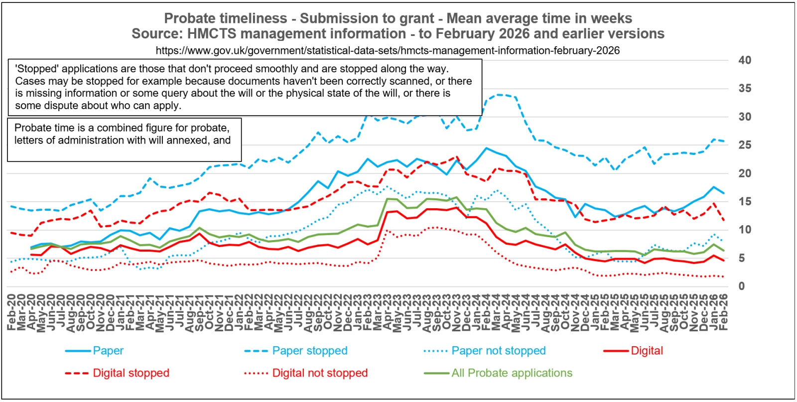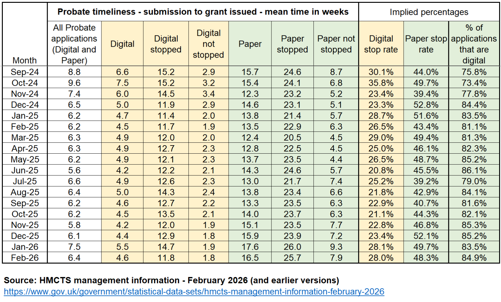 I've not posted up monthly HMCTS figures for a while, but here are the HMCTS February probate wait times. The table has been created by me from the data. The monthly update data is published on the second Thursday of each month, so the next HMCTS update will be the March data which comes out in May.