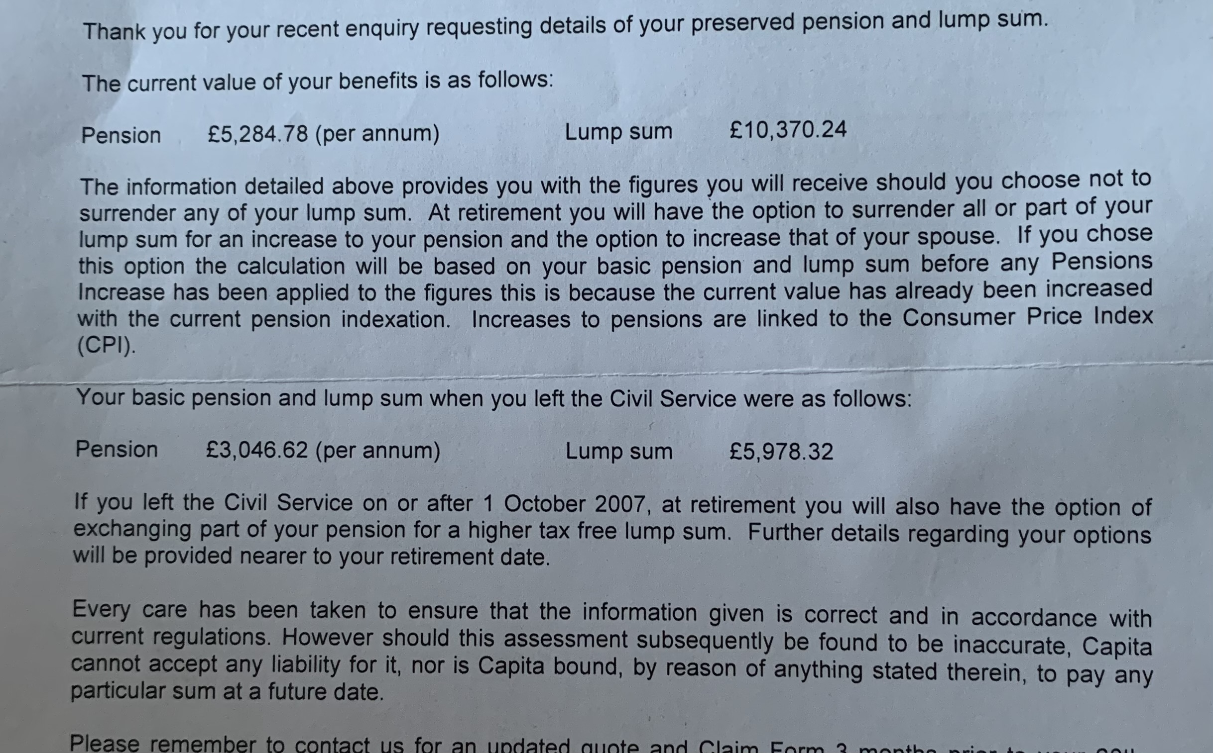 It’s a bit confusing in the previous documentation I received too. One letter dated April 2014 said that the current value was £5284 but a later statement dated October 2014 says that the pension payable is £3046. Then there is something about WPS deductions which I don’t understand as I wasn’t married at all when I worked there.hugheskevi said:It is unclear from the screen-shots whether the figures are as at date-of-leaving (1994) or re-valued figures to the current date - this will be the main thing to be clear about for your planning.