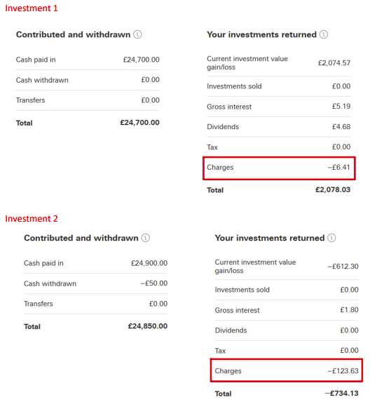 ....but both pots quoted by OP show "Investments sold £0.00" over the period, so that wouldn't appear to be the cause of the charging differential.MX5huggy said:I think if you don’t have enough cash in your account and not set up a DD to pay fees then they sell some of your biggest investment to cover fees. So which is biggest would change over time.0 -