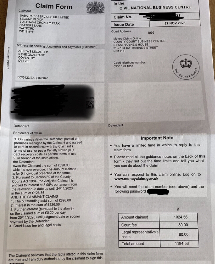 I've redacted the name at the bottom of the Claim and a QR Code and your MCOL Password; no personal data here now.