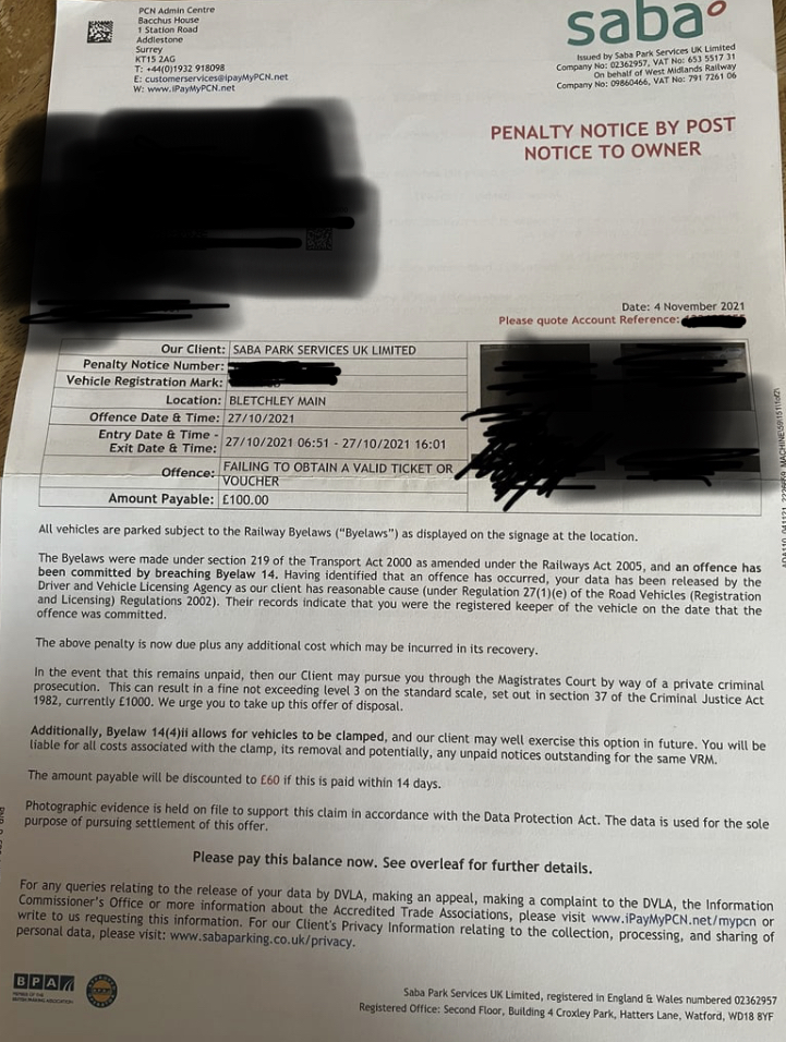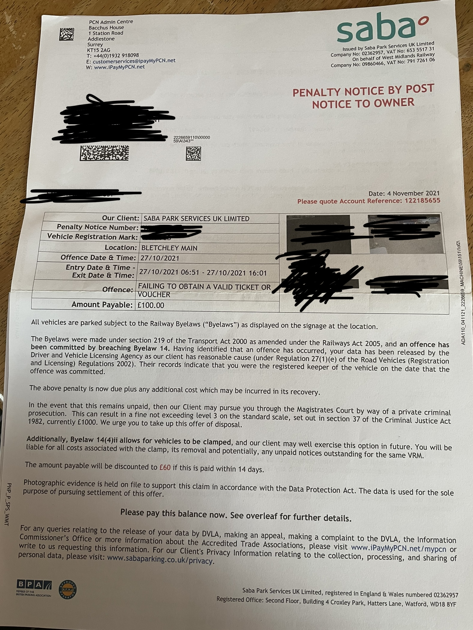 Should a vehicle owner be found to be in breach of Byelaw 14, they will be liable for a penalty charge (as displayed in that area) and any further costs incurred by the clamping, storage or removal of the vehicle. This is providing that there is (in that area) a notice advising that any vehicle parked contrary to these Byelaws may be clamped, removed and stored by an Operator or an authorised person and that the costs incurred by an Operator or an authorised person for this may be recovered from the vehicle’s owner.Penalty Notices issued for alleged breach of Railway Byelaws 2005