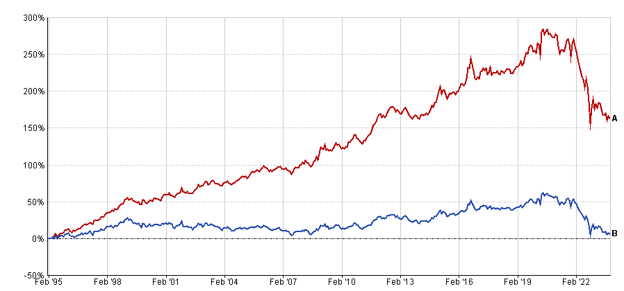 Above is a chart showing a long standing all market gilt fund. The blue line shows the unit price with income paid out. The red line shows the return if income was reinvested.
