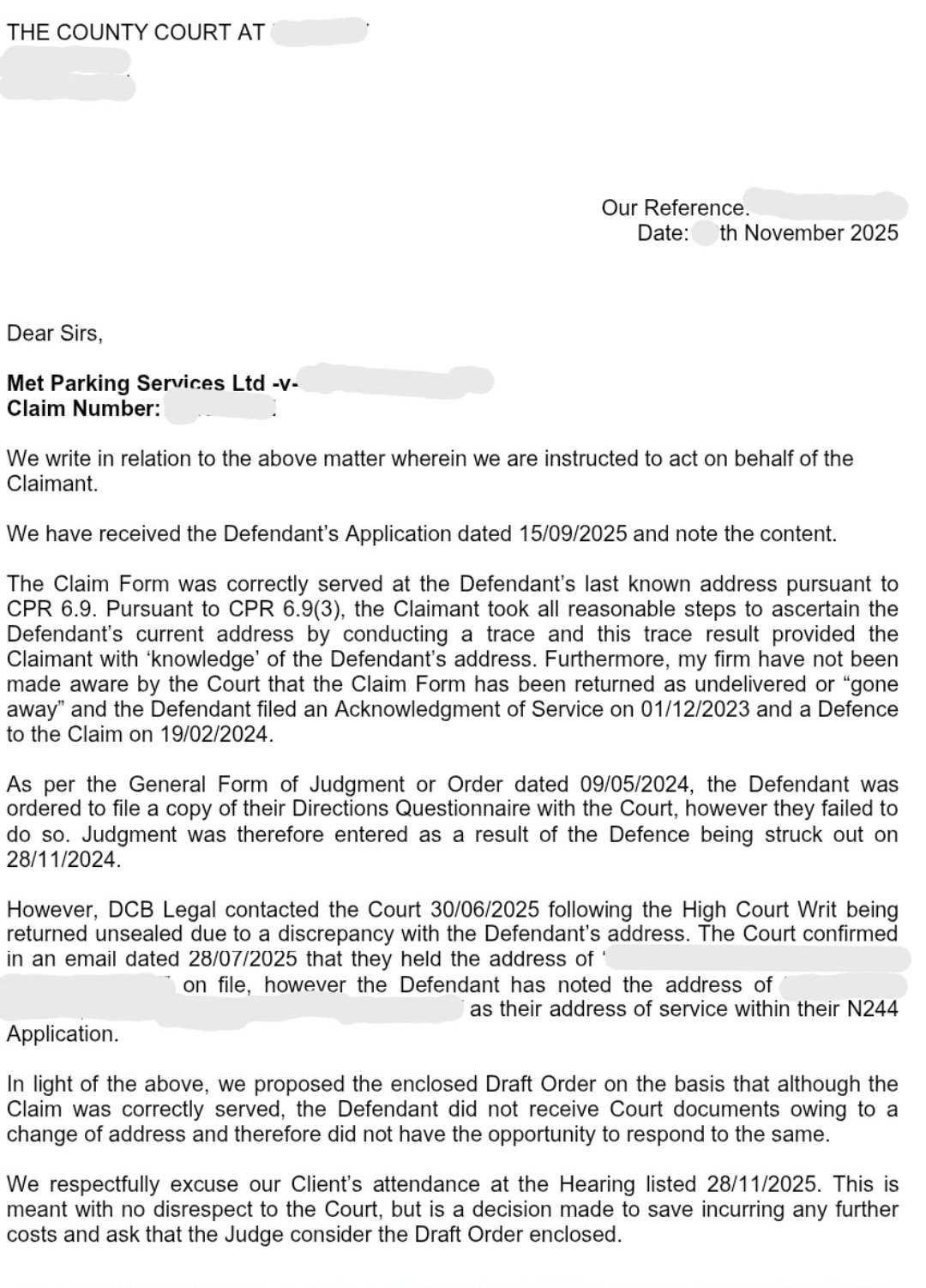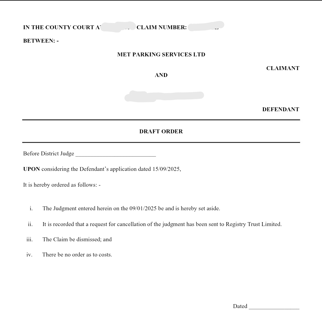 Then you can send that (once signed by both parties) to the court next week and ask for the case to be disposed of without an attended hearing: CCJ to be set aside and claim dismissed, per CPR 13.3 in view of the 'good reason' that there was a discrepancy in the address and both parties agreeing that the court form (N180) was not served and the Claimants knew this in June 2025.PRIVATE 'PCN'? DON'T PAY BUT DON'T IGNORE IT (except N.Ireland).