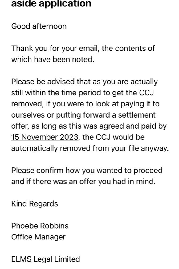 I have started things off by emailing ELMS to let them know I'll be applying for a set aside (as advised on another thread here) and received the below response - does anyone have any thoughts on this? I did think they'd be the ones to come to me with an 'offer' to settle. I would be tempted to pay up to £75 to settle and avoid the stress of taking this to a hearing (as much as that pains me to give in).
