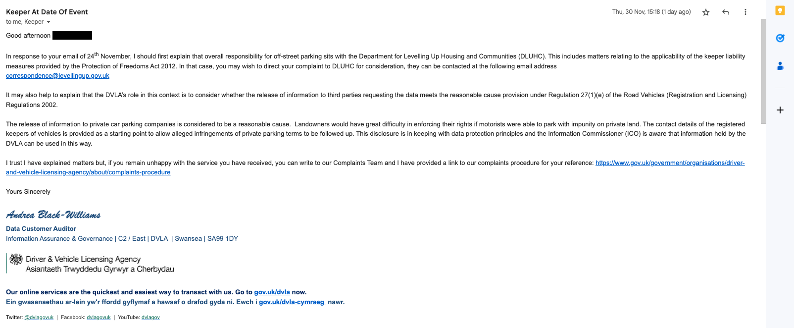 Kind if makes sense now, but that's new. And the DLUHC isn't going to want to field complaints all of a sudden, which are really about the DVLA giving out data which is then being used for a purpose it wasn't released for.