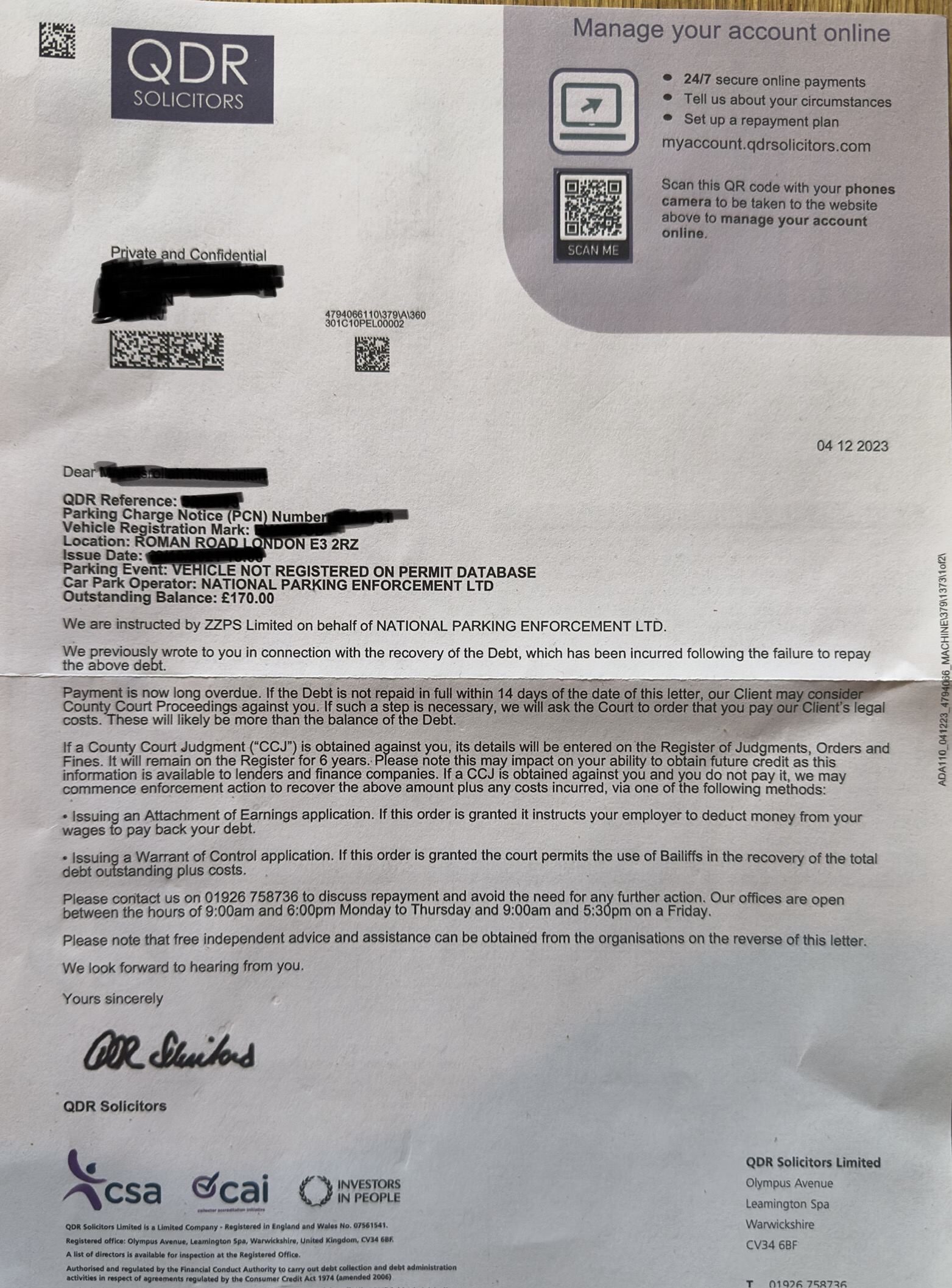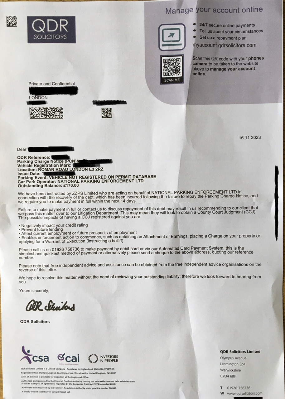 I’ve received this letter yesterday from ZZPS Legal debt collection company on behalf of National Parking Enforcement ltd, back to October 21 and as I remember it was a private road which I parked max 10-12 minutes to see the sign and also asked next restaurant if it’s under their premises which I can park. By the way I can’t remember if I challenged it or ignored it!!😬