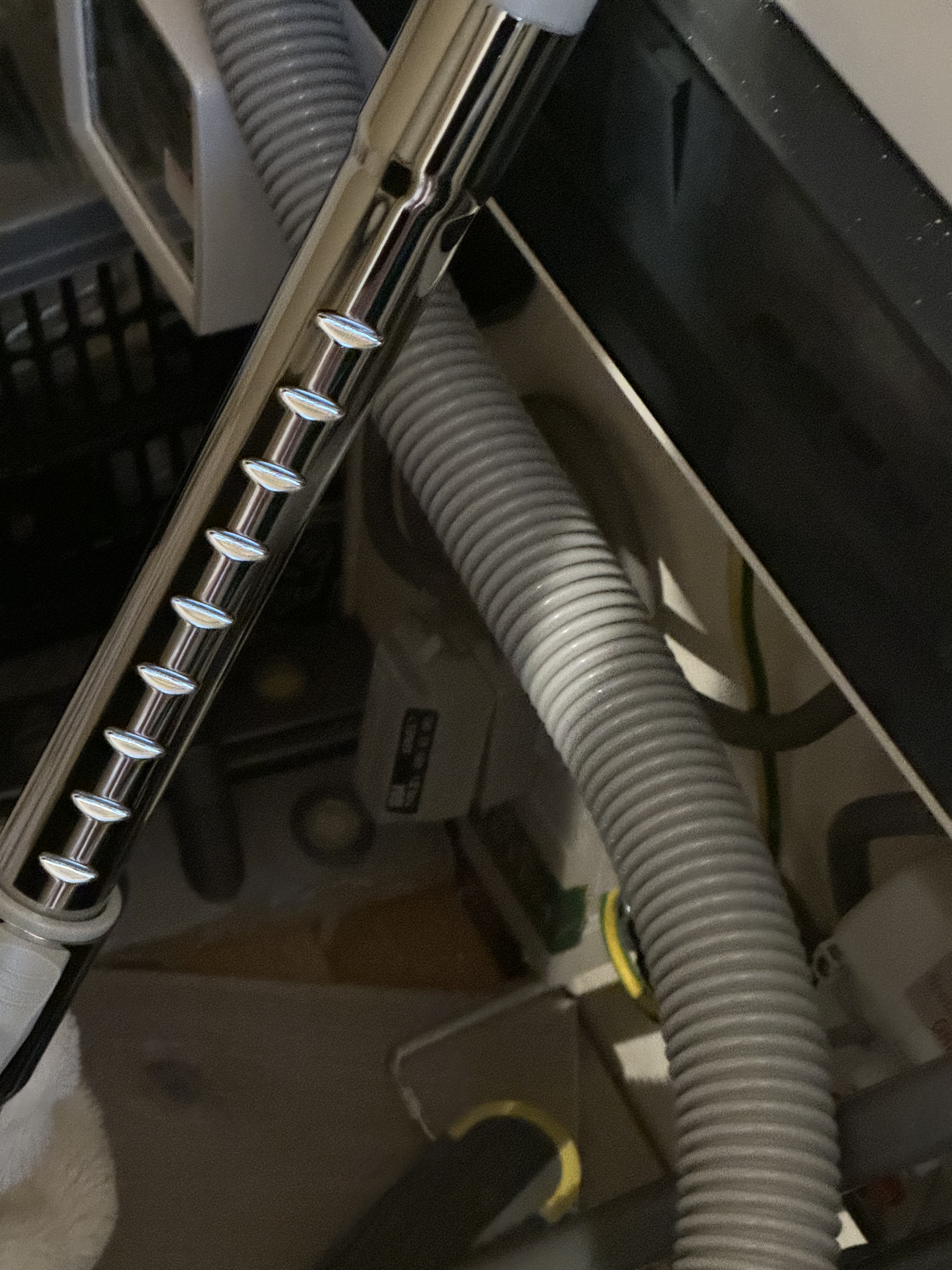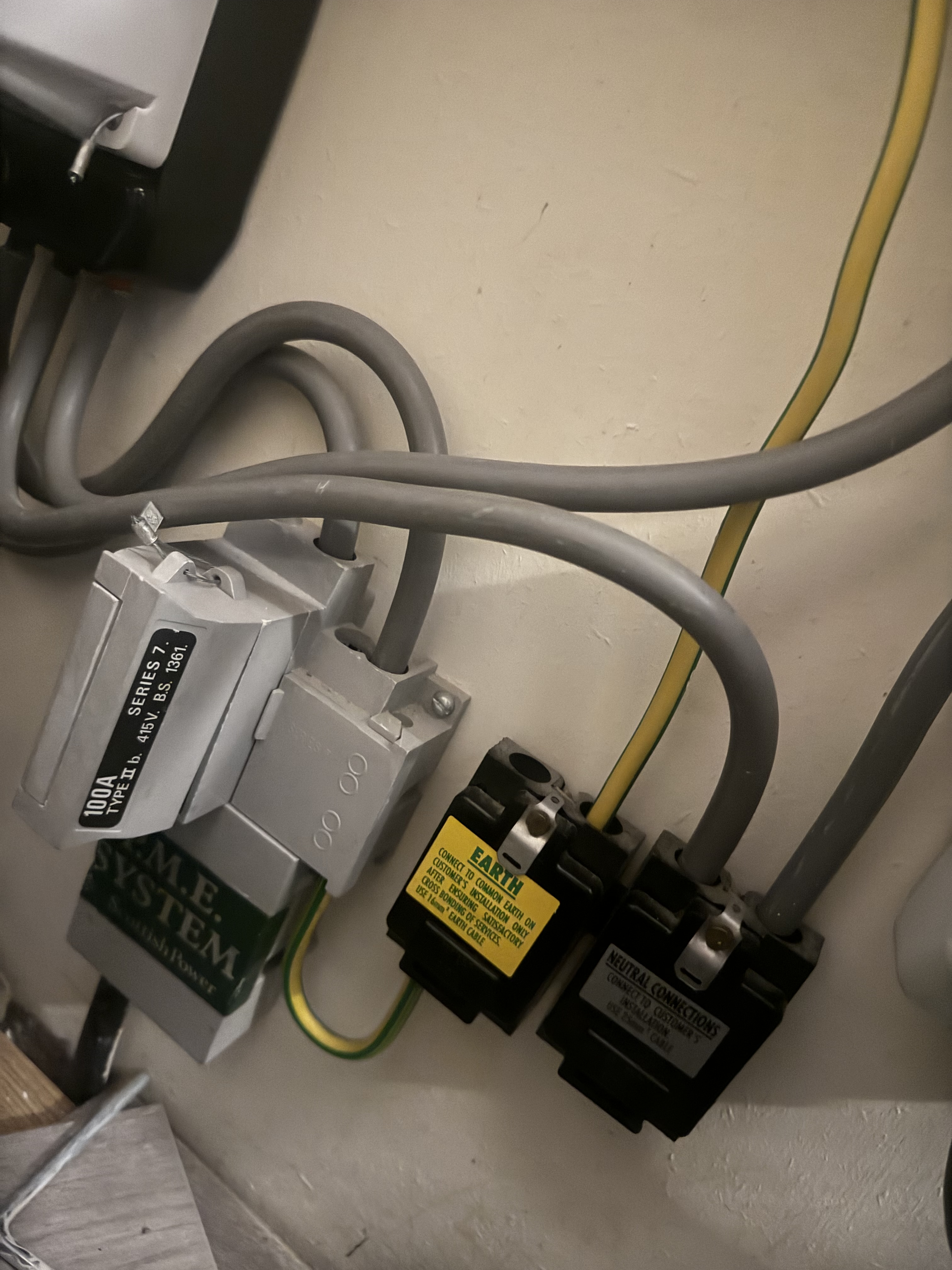 Difficult to tell from single angle - but there seems to stuff on the floor. And is that grey hose also part of the potentially at a guess silver hoover tube ? - looks to be lying on white box at lhs (actual meter?) and possibly close to earth wire - although darker grey tube could be protecting it and white box below.