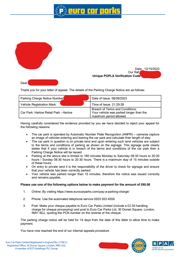 And, you need to check your junk emails for the rejection letter (it has the POPLA Code) and tell us the date on that rejection?