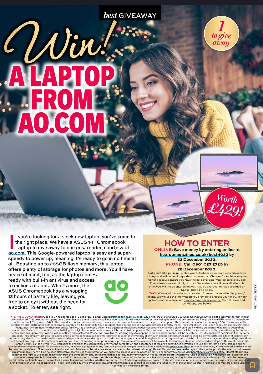 The prize is a ASUS 14" Chromebook Laptop courtesy of AO.com, worth £429. The prize does not include any software or hardware not mentioned in the prize description. The prize will be sent out in January 2024.