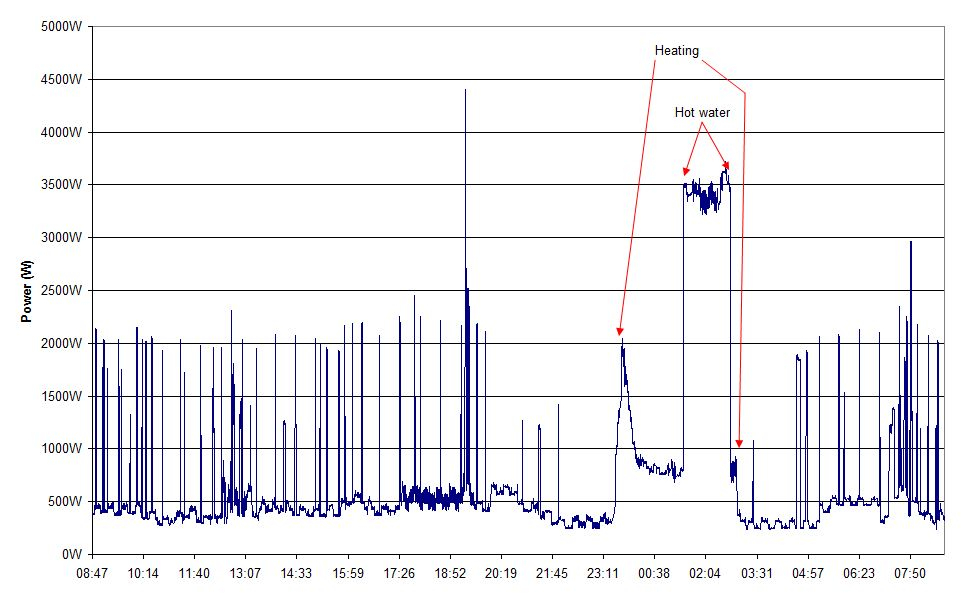 Thought it might be useful to add another plot, but for a night when the heating has come on. Having the heating on for about three and a half hours last night added about another 2.2kWh to the energy consumption. For anyone concerned that heat pumps draw a lot of power then these data might be useful.My air source heat pump has an output rating of 7kW maximum, but as can be seen from the power it draws when on, it starts out drawing up to about 1.6kW for the first 10 minutes that it's on, then settles right down to drawing slightly less than 500W when running. It is supplying water at 35°C to the underfloor heating and to a buffer tank that preheats the hot waterThe hot water system used more energy last night than the heating, which is often the case. Over a year heating hot water uses more electricity than anything else we have, including the electric central heating or charging the car.
