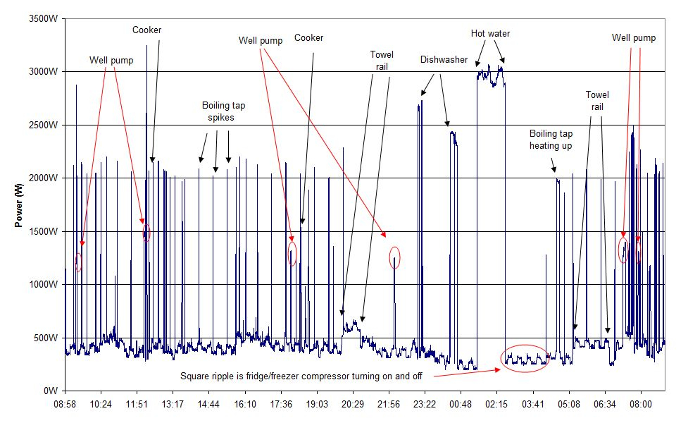 Our background load is higher than for many, as we have heat recovery ventilation, a UV disinfection unit and the treatment plant blower pump running 24/7, plus a well pump that kicks in several times a day (comes with being off the sewage and mains water grid).