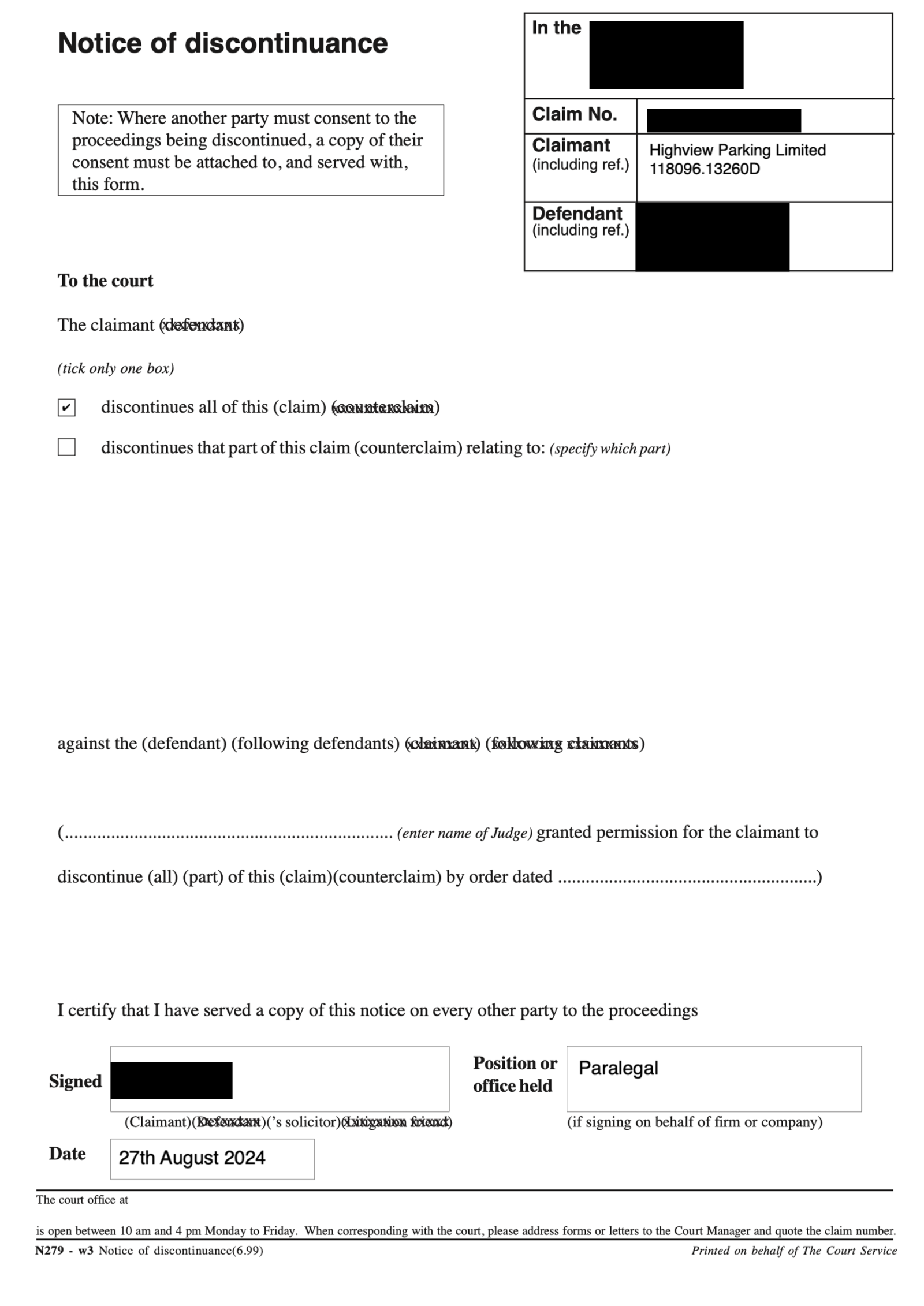 Here is the final 'Notice of discontinuance'. The email came from DCB Legal on behalf of Highview Parking.
