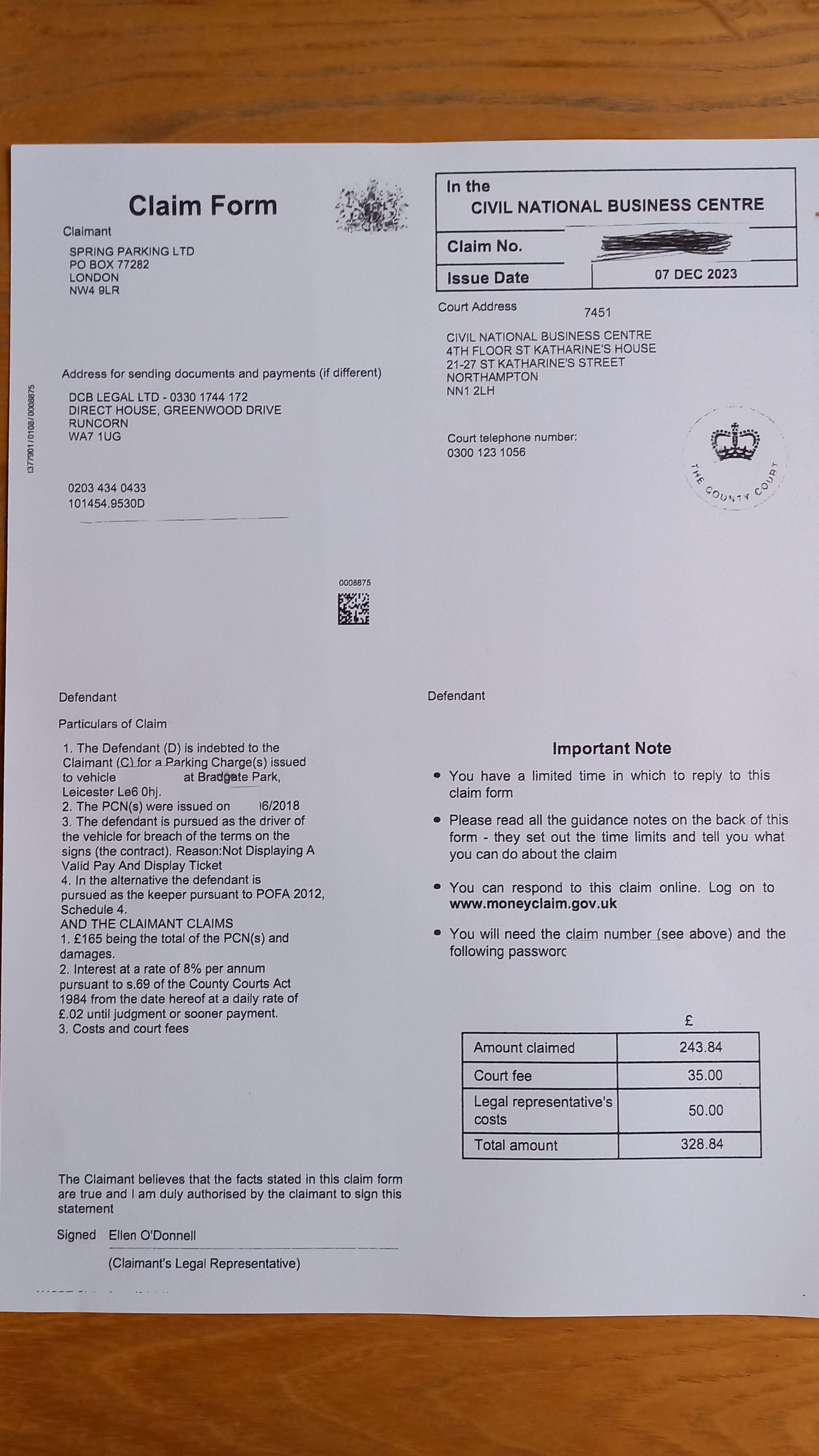 Defense help needed for DCB Legal / Spring Parking claim issued on the 7th of Dec.