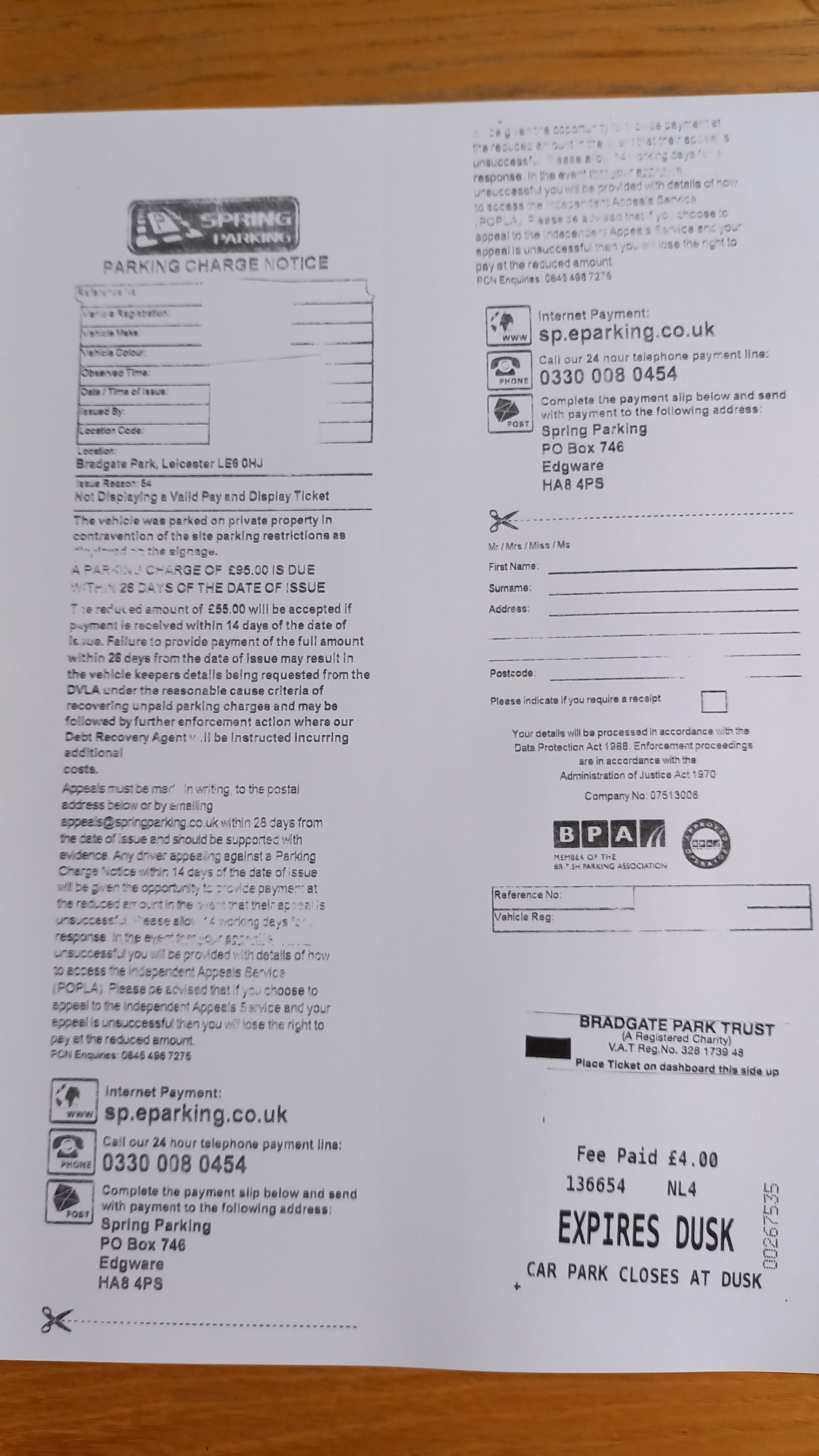 A Parking Charge Notice was issued in 2018 by Spring Parking, stating the reason as “Not Displaying a Valid Pay and Display Ticket”.