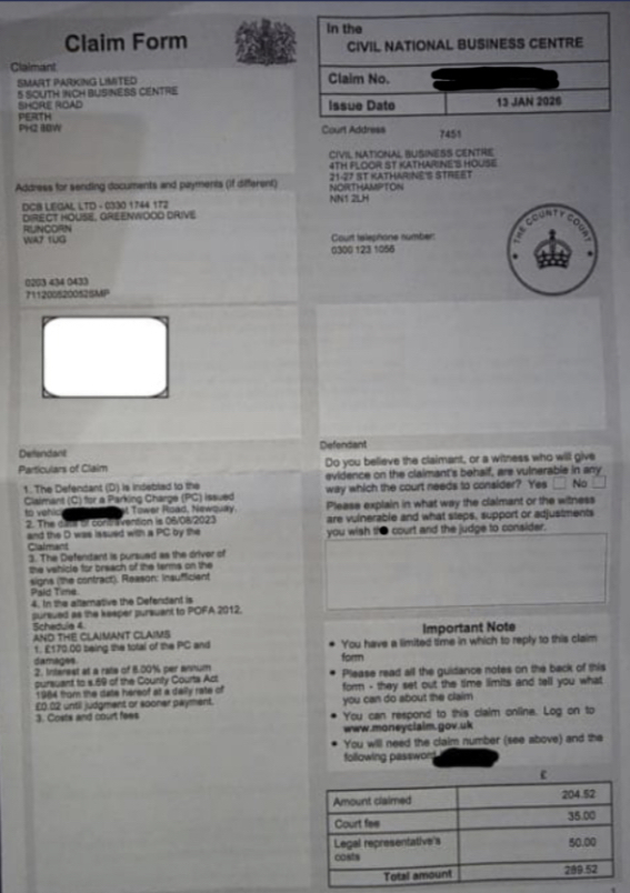 Smart Parking DCB Legal court claim issued 13th January 2026