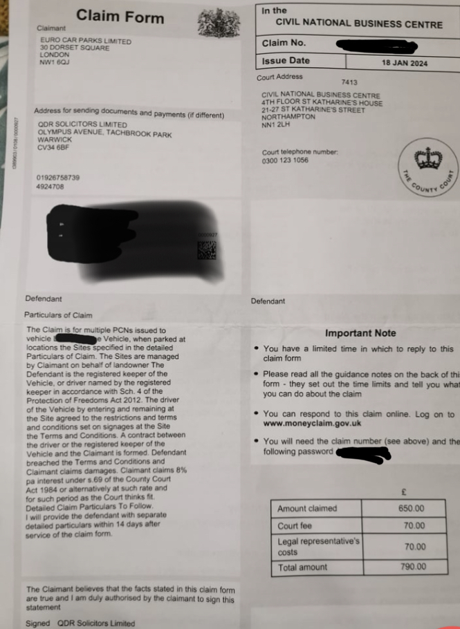 I've received a claim form from parking eye's solicitors (QDR Solicitors Limited) claiming several hundred pounds for a series of parking tickets I received almost 5 years ago at a hospital car park (previous member of staff).