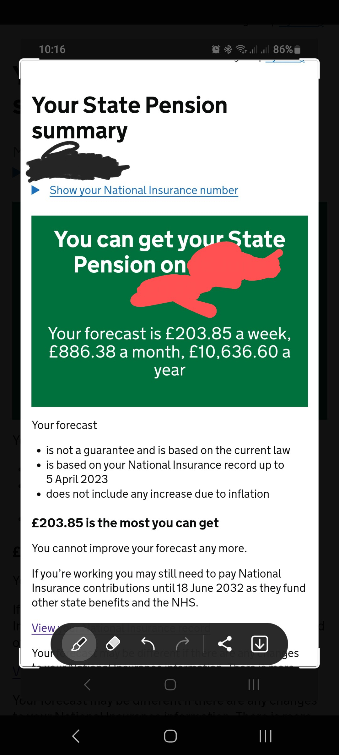 I am still working but thinking about early retirement at 59, due to this tinnitus is really starting to get to me.LHW99 said:Have you actually checked your SP prediction?Read it all, as the top bit is predicted on how many more years you could need to contribute.Also, you could need more or less than the off publicised (incorrectly) "35 years" because only those starting work after 2016 actually need that. Also, as long as you are working / earning you still have to pay NI.