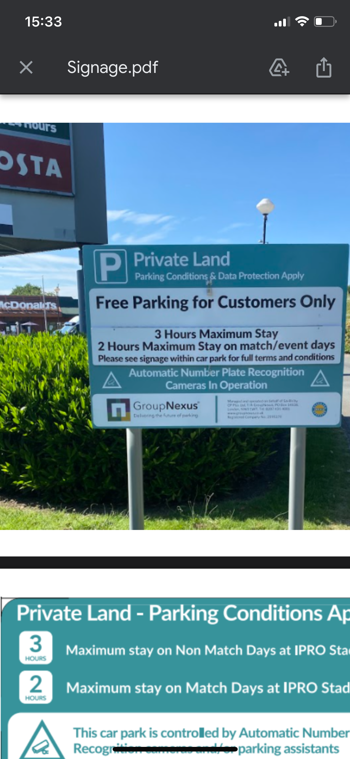 Hi so this is the latest… ”In relation to the contract between our Client and yourself, the signs on site clearly outlined the Terms of parking and you were on notice of the Terms upon entering the Land. By parking on the Land, you accepted the Terms. These Terms state 2 hours maximum stay on Match Days at IPRO Stadium, and that if the Terms are breached, you agree to pay a Parking Charge of £100.00. The Vehicle entered the site at 11:29 and exited at 13:47 remaining on site for 2 hours and 18 minutes, therefore; you breached the terms and agreed to pay a Parking Charge within 28 days.