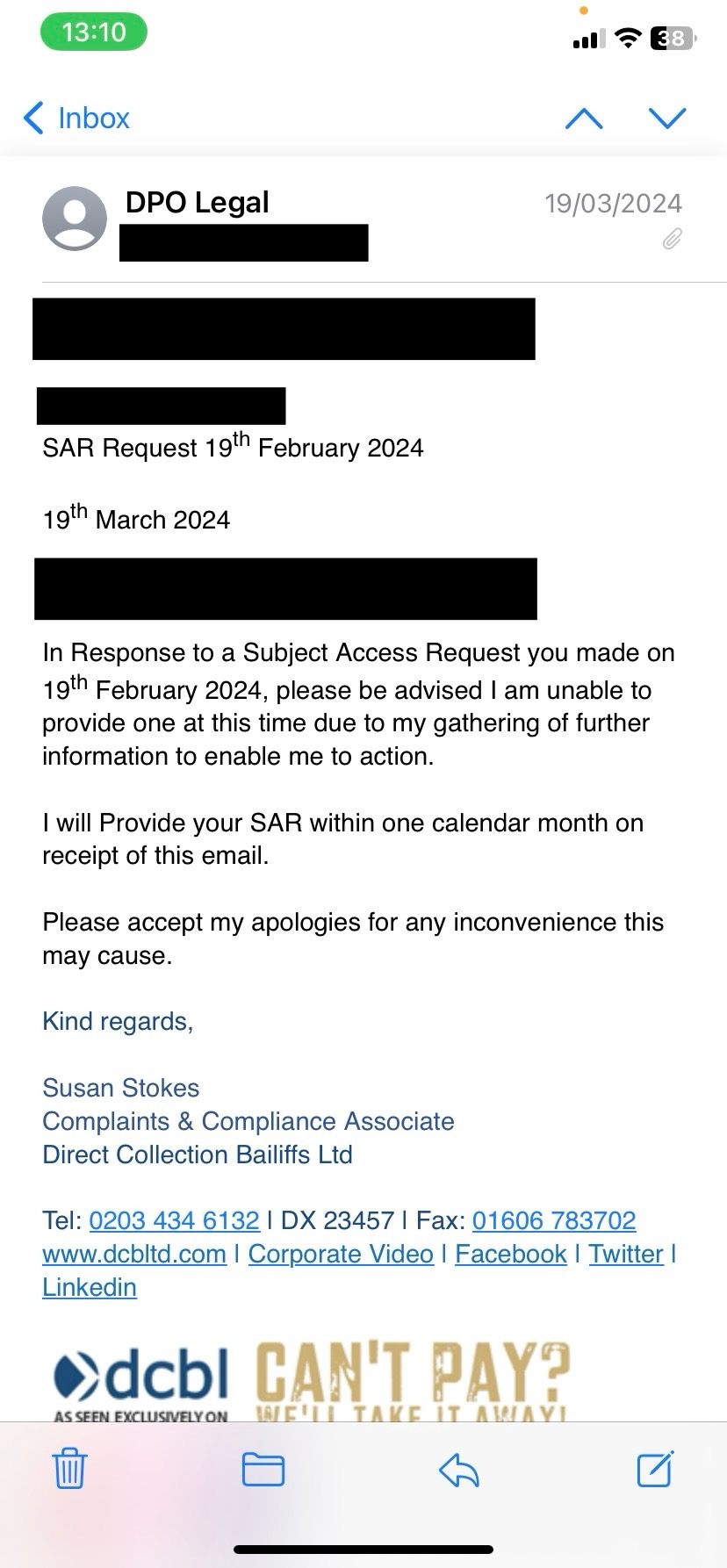 38. On 19/03/24 I received an email from DCBL’s DPO (Attachment XXXXX) This email was totally unsolicited and arrived without me providing any of the identification or information requested by Mr. Hinton previously. It asked for another month to provide the information on top of the month it had taken for them to reply. It appears that they didn’t need more information to honour my request after all, again, they just needed a counterclaim filing against them.