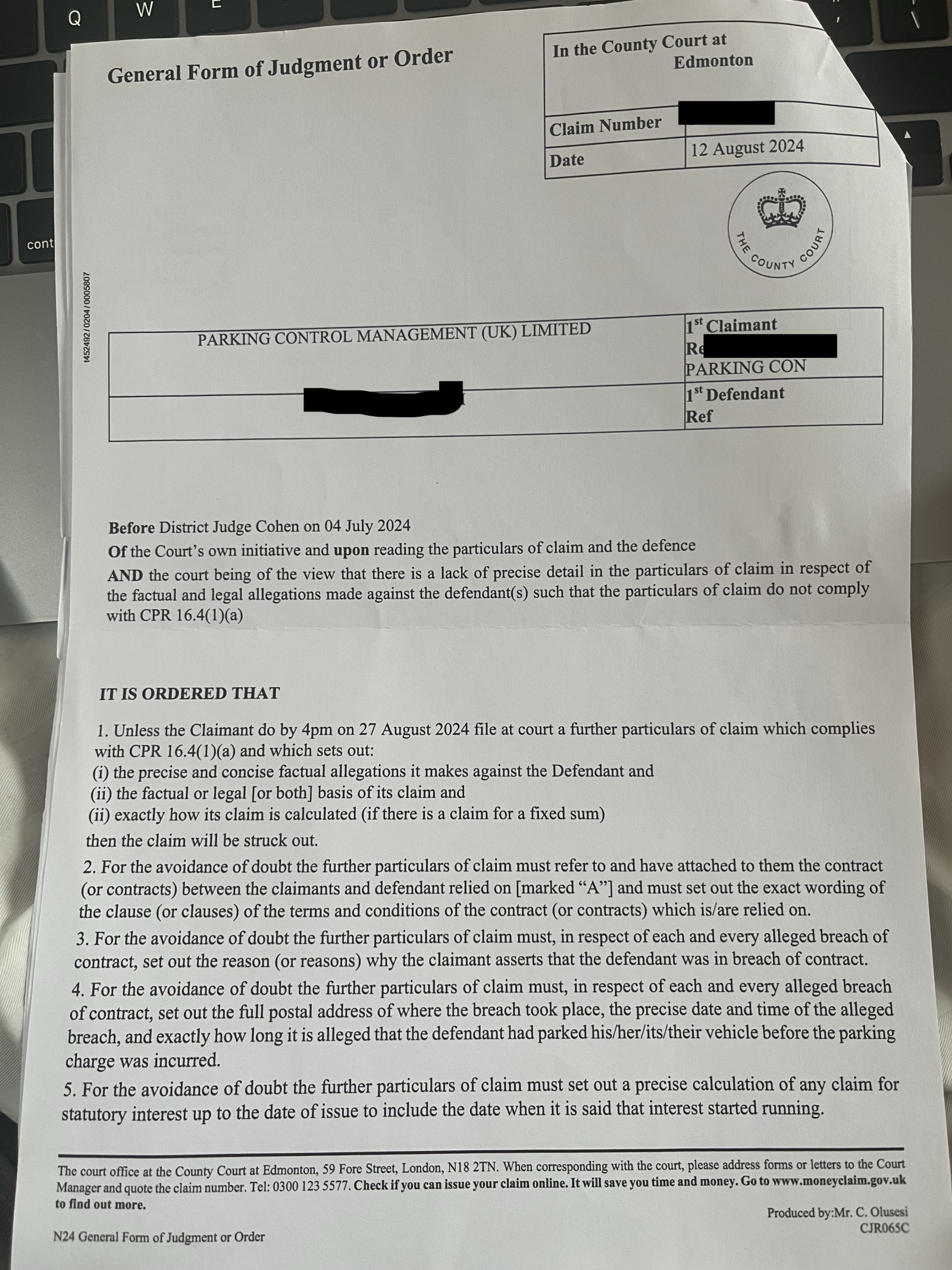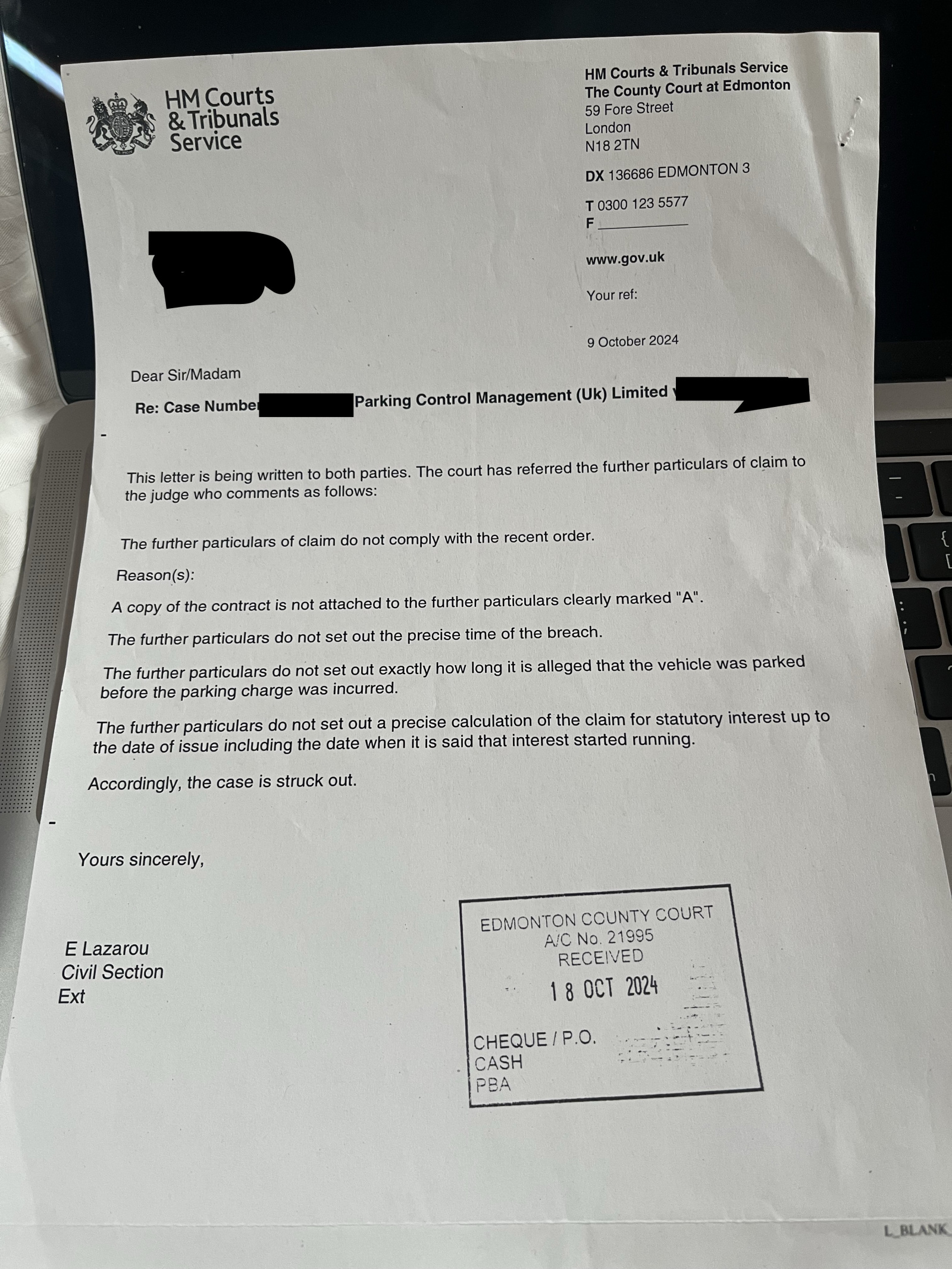 9th October I received a letter from the courts stating the case had been struck out as the particulars of claim did not comply with the recent order: