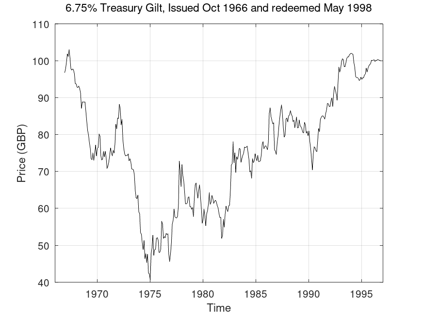 Here the investor would have seen the capital value of their gilt drop by 60% over the first decade or so and this would also have been coupled with high inflation in the 1970s (the purchasing power of the £100 in 1998 was about 1/8th of that in 1966). However, for someone using such a gilt to provide retirement income, the 6.75% coupon was not too bad. It is also worth noting that the variation in price over the last 5 years or so was relatively small.