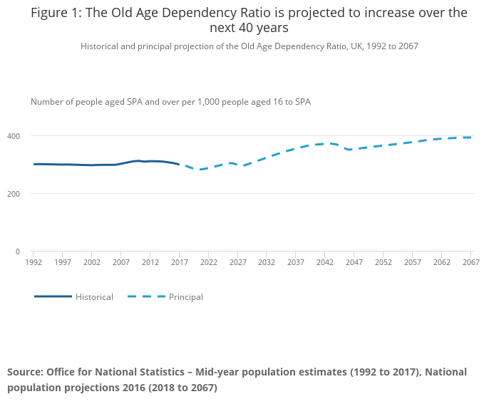 Chart added to further the discussion.The UK population is changing in both size and structure. By 2050, it is projected that one in four people in the UK will be aged 65 years and over – an increase from almost one in five in 2018. This is important since the ageing population has implications for a number of policy areas.