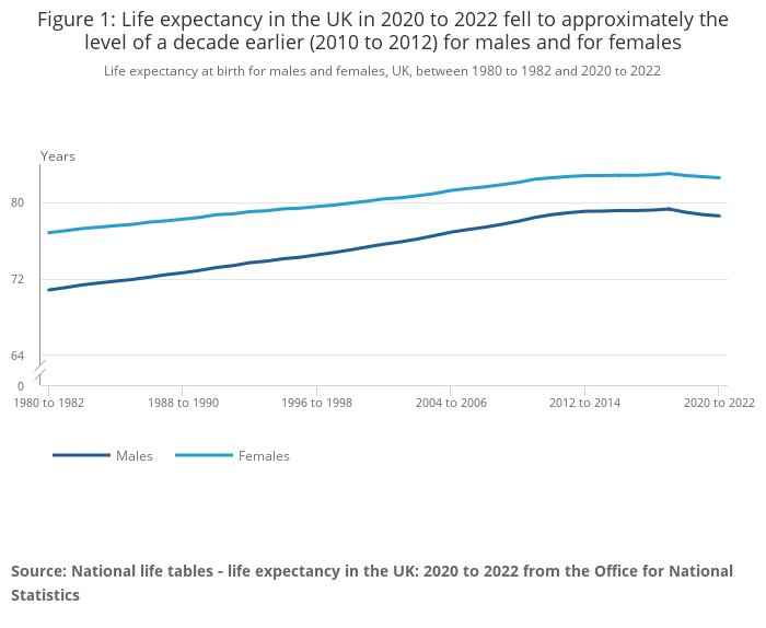 There is a minor anomaly caused by Covid slightly increasing the death rate, however even with the expected impact of lifestyle diseases the long term trend will likely to continue upwards, though at a reduced pace. The biggest issues will however come from the huge rise in obesity and the strain that it is putting on the health service, the life expectancy will continue rising but the number of healthy years people have is already starting to decline, increases in T2 diabetes, circulatory conditions and joint damage are putting more and more strain on the health service and doing so earlier in people's lives than ever before. That, combined with diseases of aging such as dementia and cancer create a particularly expensive problem that we will have to solve.BlackKnightMonty said: