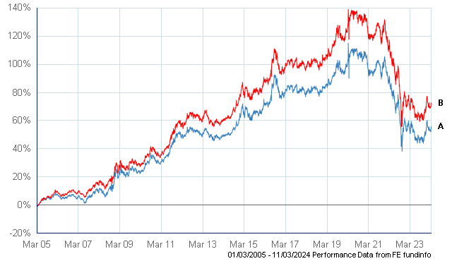 The M&G Gilt fund with a reasonable benchmark included . Even before the pandemic there's still volatility but not enough to cause investors to question their asset allocations. Could be argued everyone is happy ? Now set the same chart from 2005 -2024. The M&G fund is up around 50%.