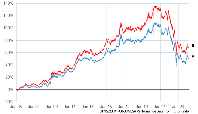 The M&G Gilt fund with a reasonable benchmark included . Even before the pandemic there's still volatility but not enough to cause investors to question their asset allocations. Could be argued everyone is happy ? Now set the same chart from 2005 -2024. The M&G fund is up around 50%.