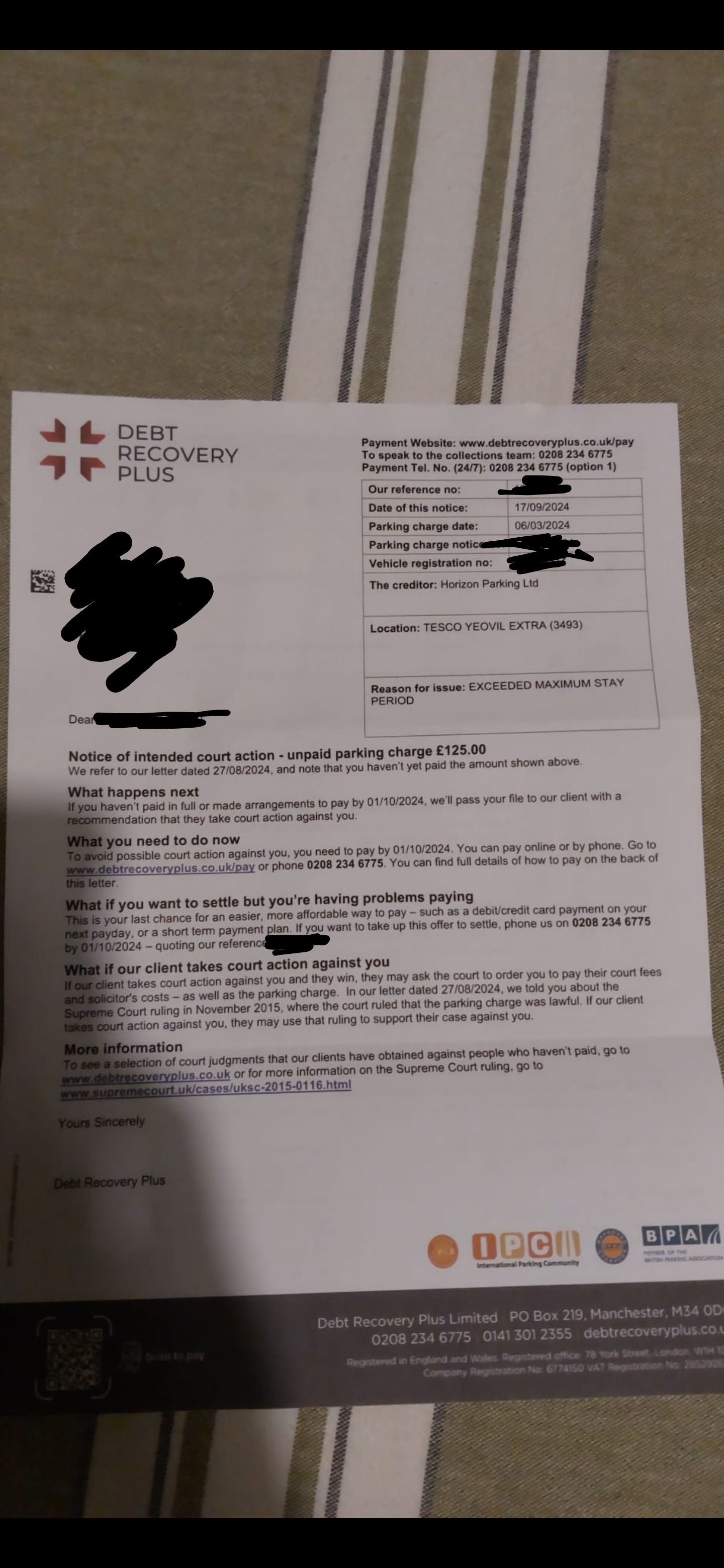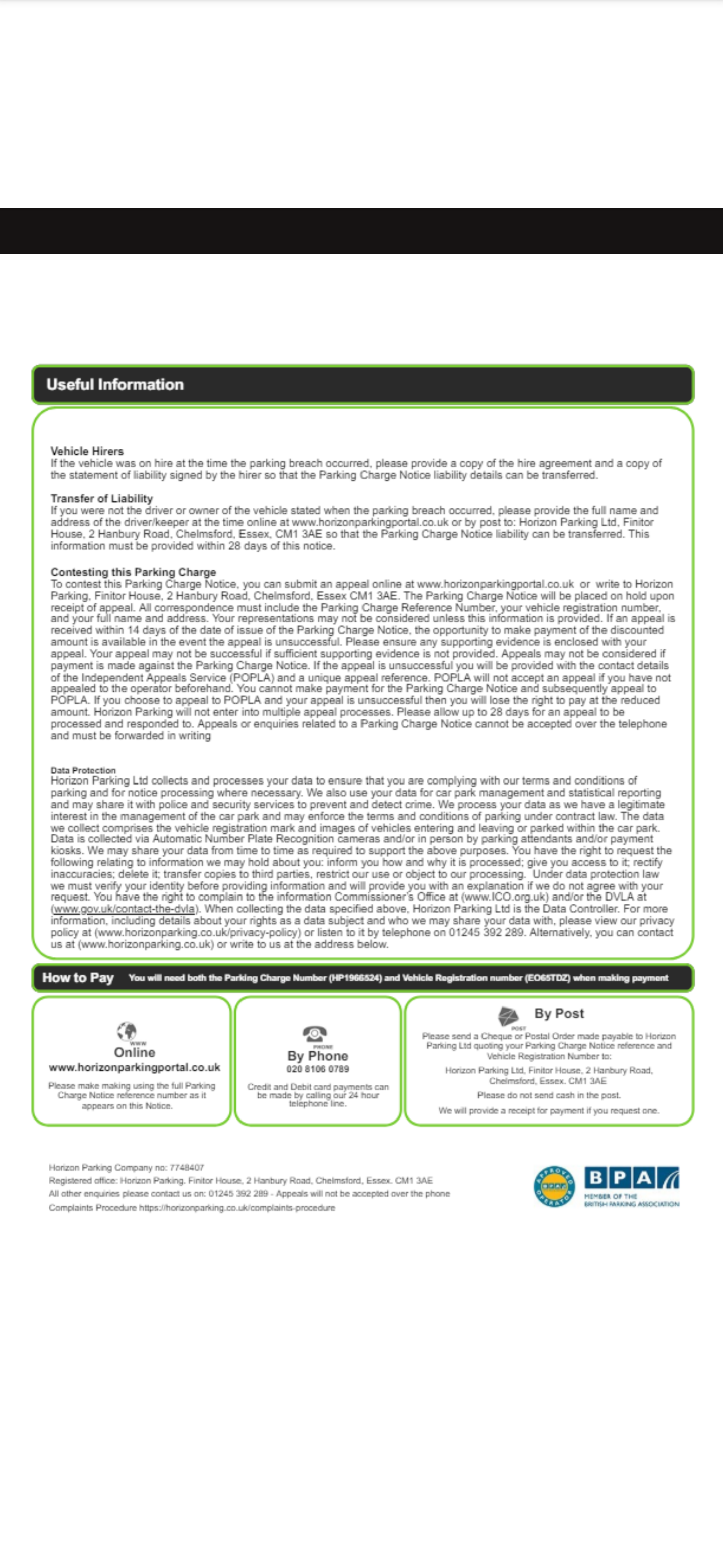 It doesn't sound like Plan A has been exhausted and I'd be astonished if Tesco don't have legal title in the car park that an Extra and a petrol station sits on. Also, given Horizon is Tesco's usual PPC, even if they only lease the site, I'd be amazed if the manager can't cancel this PCN.PRIVATE 'PCN'? DON'T PAY BUT DON'T IGNORE IT (except N.Ireland).