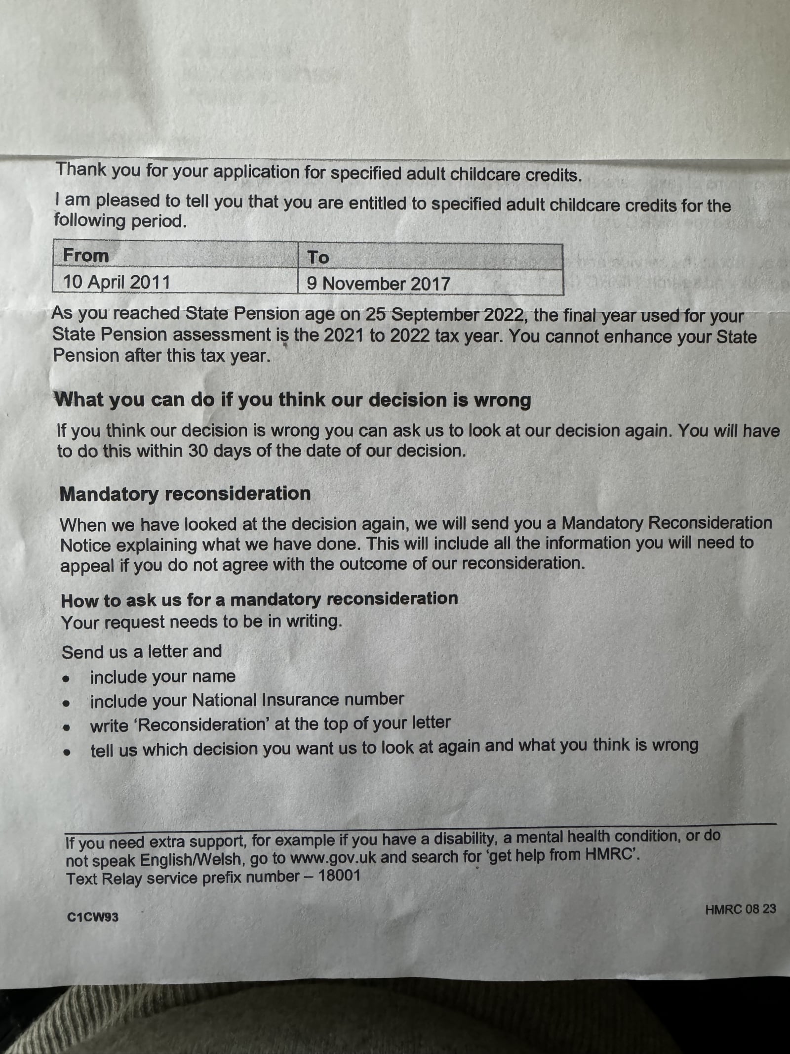 The decision letter (I’ll see if I can attach) states she is entitled to the childcare credits we claimed for however as she reached state pension age in Sept 2022 the final year used for her pension assessment was the 2021-22 tax year and her state pension cannot be enhanced after this year.