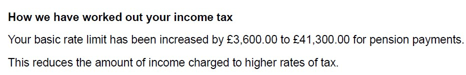 But don't forget that pension contributions reduce the amount of tax paid at 40%I make annual £3,600 gross contributions and it increases my basic rate band by that gross contribution. So £37,700 becomes £41,300This effectively raises the higher rate threshold by £3,600 from £50,270 to £53,870 (or £41,300 + £12,570) which will easily cover your £52,560 (£49,500 + £2,700 £3,060). In fact you'll have more BR headroom at £1,310. So it's worth doing