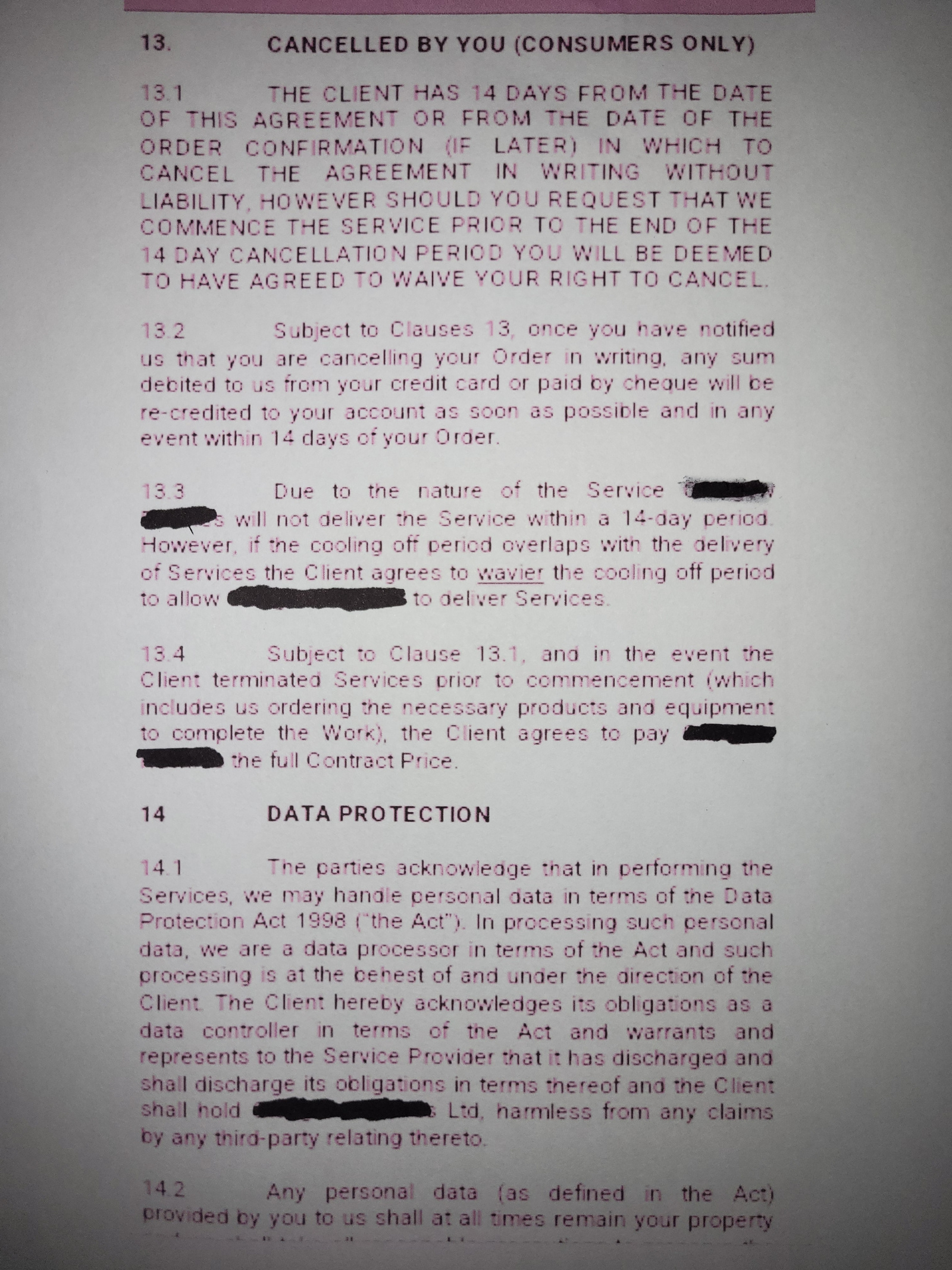 I have read the contract I signed and the only thing that worries me is 13.4? Can anyone elaborate on this for me? What if they say they have ordered products and equipment for the job and try and keep the 50% I have paid or even try to get the full contract price from me?