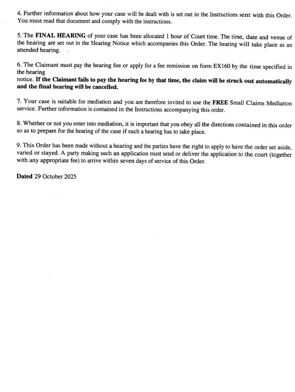 Why do you think that, are you going to turn up at court without a witness statement, what will the judge rely on as your case and your evidence to support your defence?Pfazer69 said:Post mediation call. I have received a "Notice of Allocation Small Claims Track (Hearing)" letter from my preferred local court. It mentions both parties must submit witness statements by the end of the month but this isn't really relevant to me. The claimant is also asked to file various pieces of evidence:@Pfazer69 - why do you think a WS from you isn't relevant? Apols if I've overlooked something fundamental that supports your presumption.Please note, we are not a legal advice forum. I personally don't get involved in critiquing court case Defences/Witness Statements, so unable to help on that front. Please don't ask. .